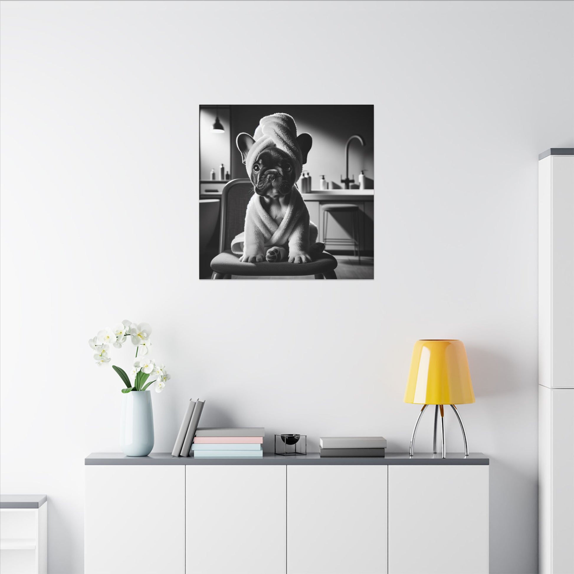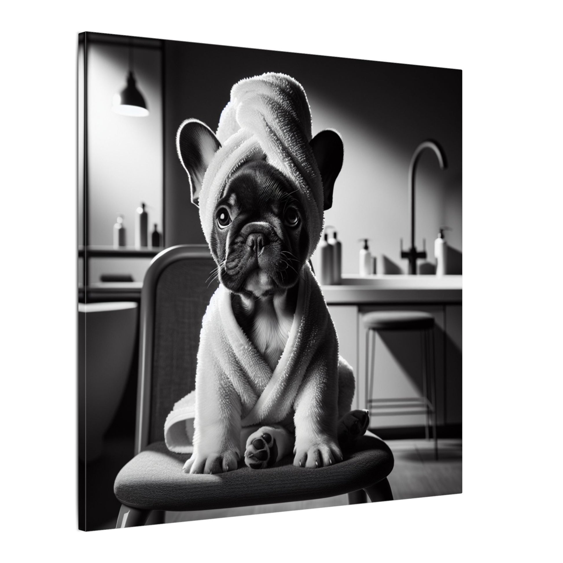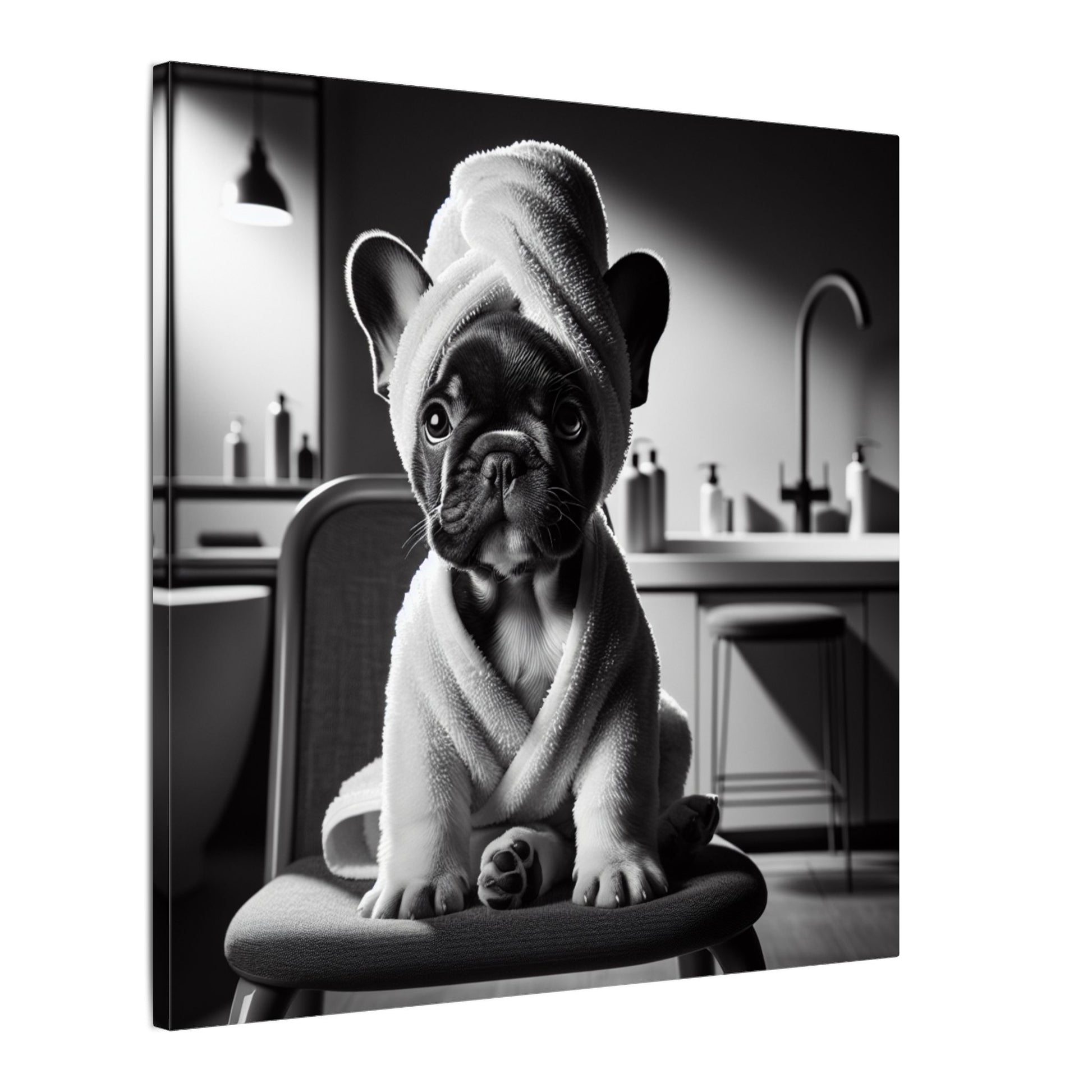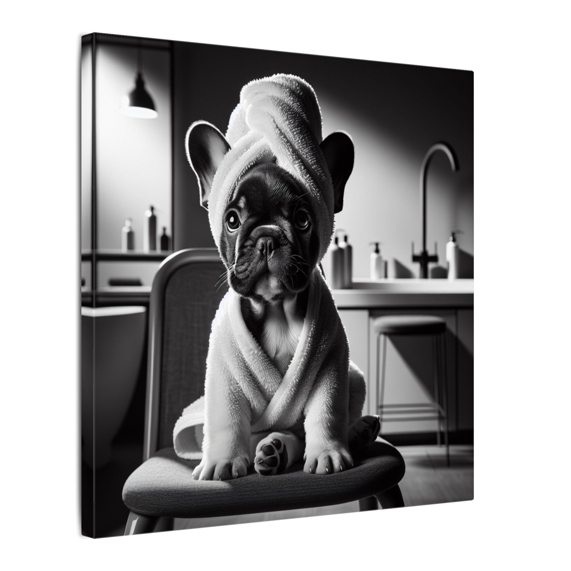 Add a touch of luxury to your home decor with this black and white French bulldog canvas print, featuring the pampered pup in a spa-like setting with a towel wrapped around its head. Perfect for dog lovers and those who appreciate whimsical and adorable art pieces. Ideal for adding a playful yet sophisticated touch to your bathroom or any room in your house. Great for dog lovers, pet owners, and those looking to add a unique statement piece to their home decor. Perfect for birthdays, Christmas, housewarmings, or any special occasion.