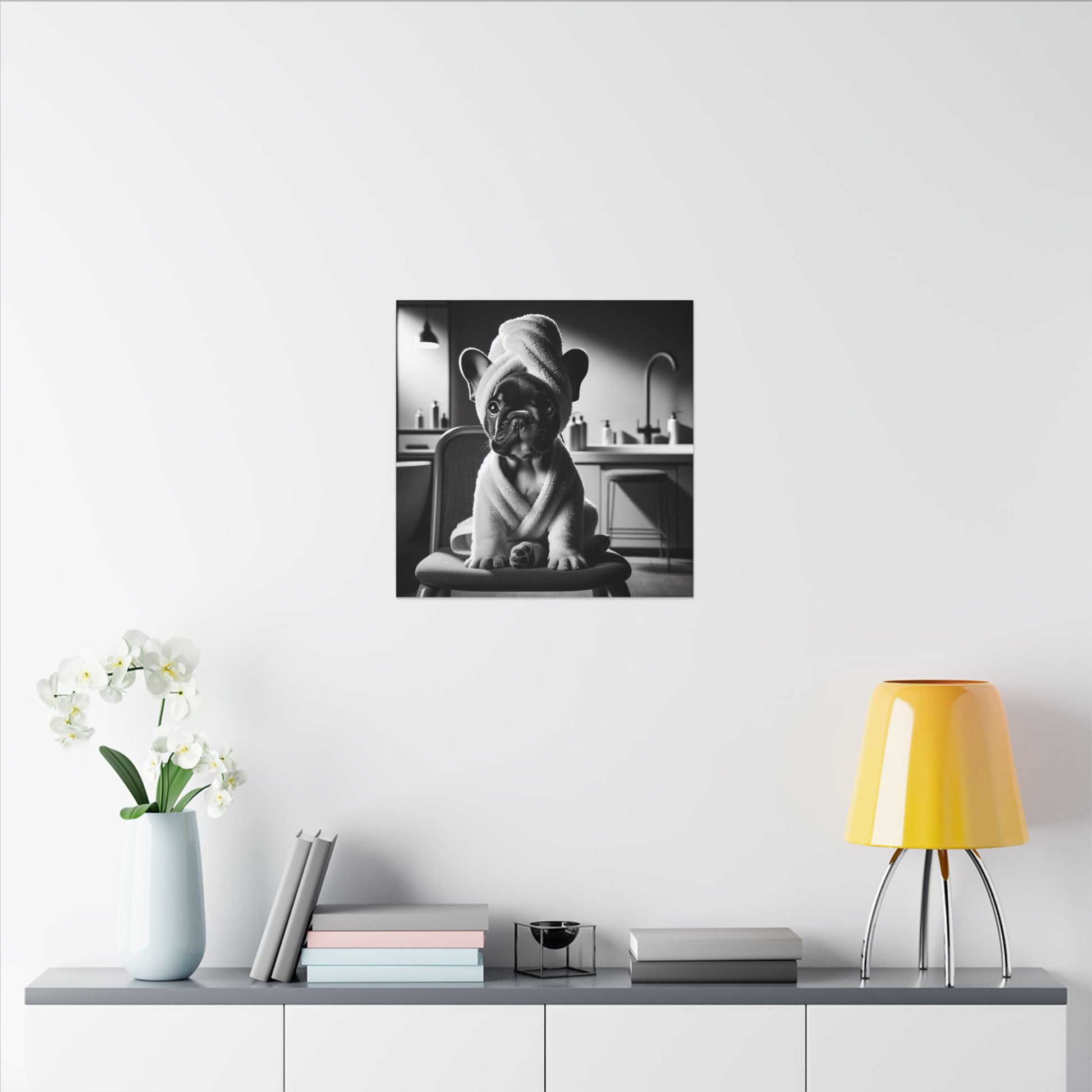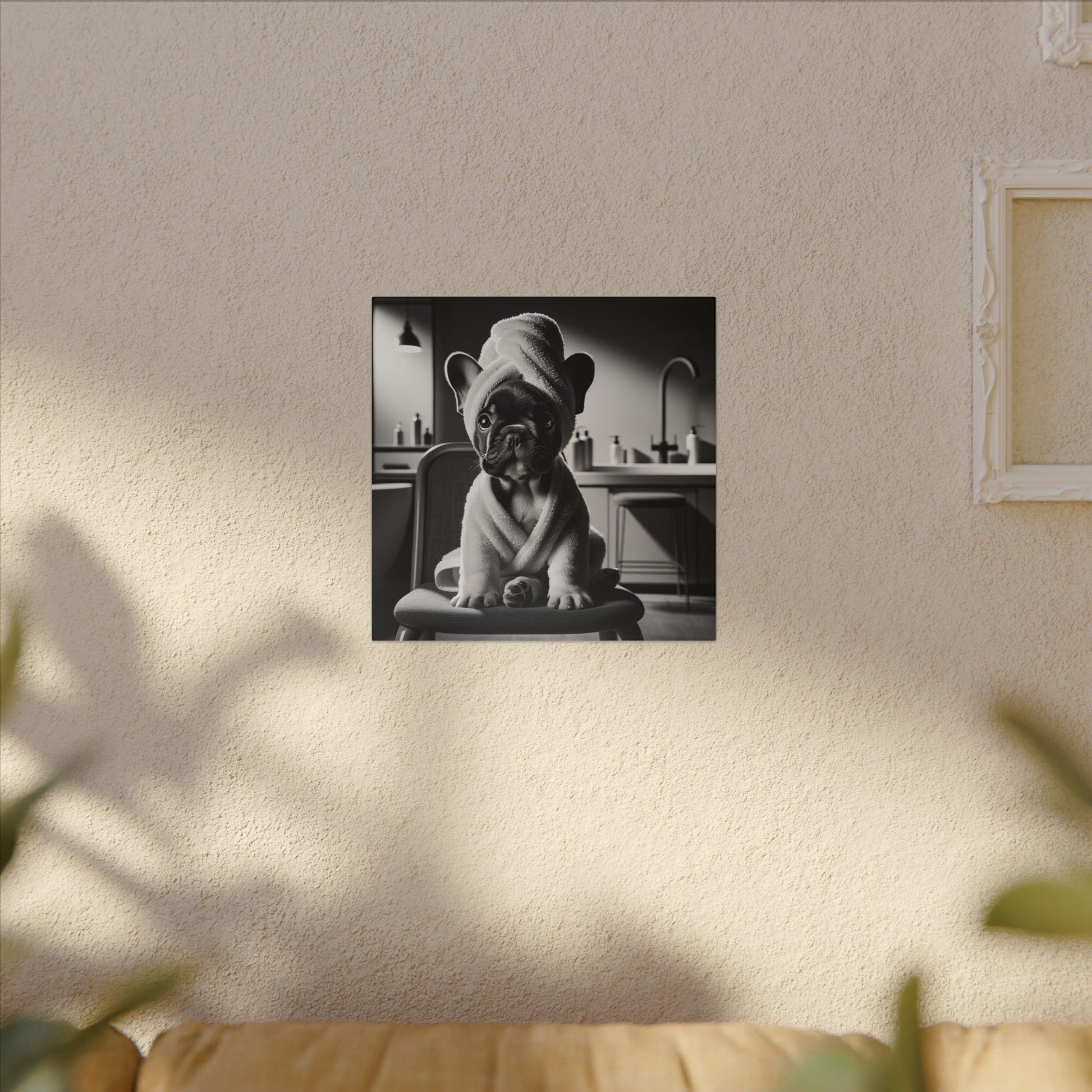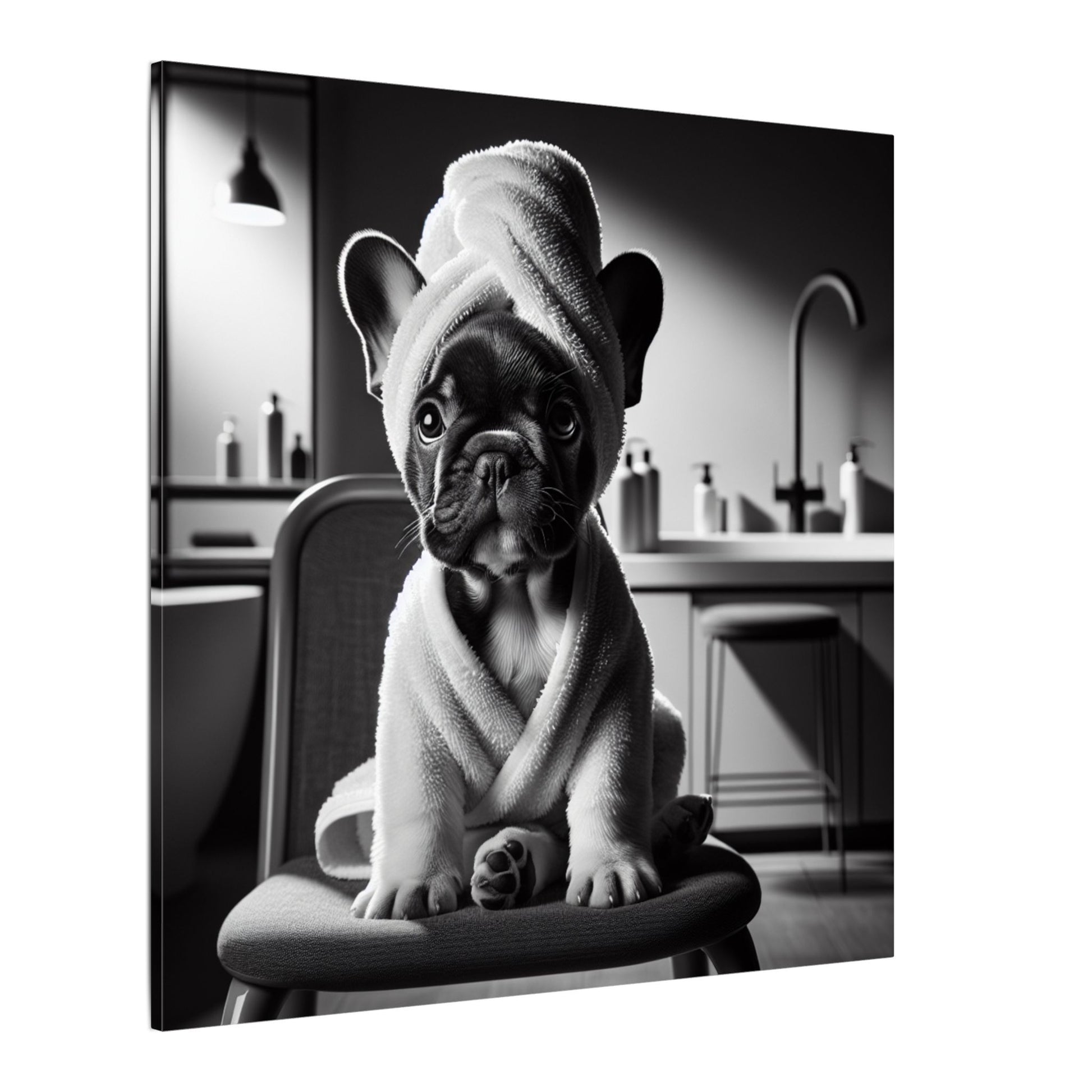 Add a touch of luxury to your home decor with this black and white French bulldog canvas print, featuring the pampered pup in a spa-like setting with a towel wrapped around its head. Perfect for dog lovers and those who appreciate whimsical and adorable art pieces. Ideal for adding a playful yet sophisticated touch to your bathroom or any room in your house. Great for dog lovers, pet owners, and those looking to add a unique statement piece to their home decor. Perfect for birthdays, Christmas, housewarmings, or any special occasion.
