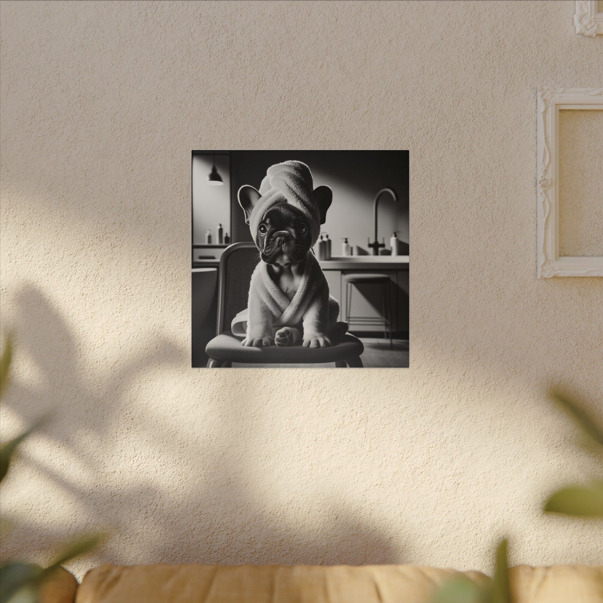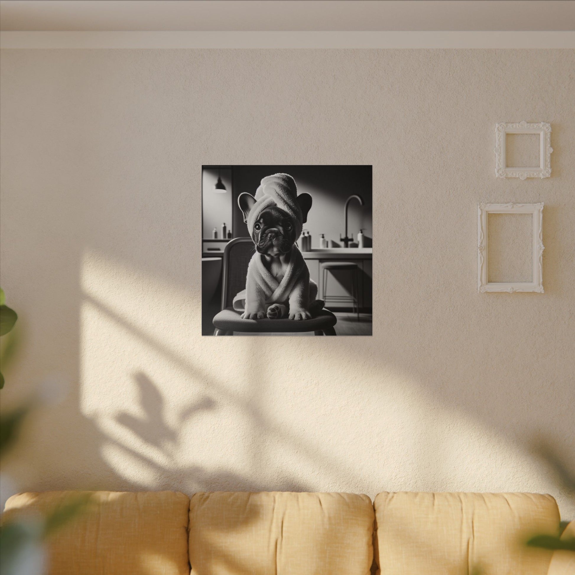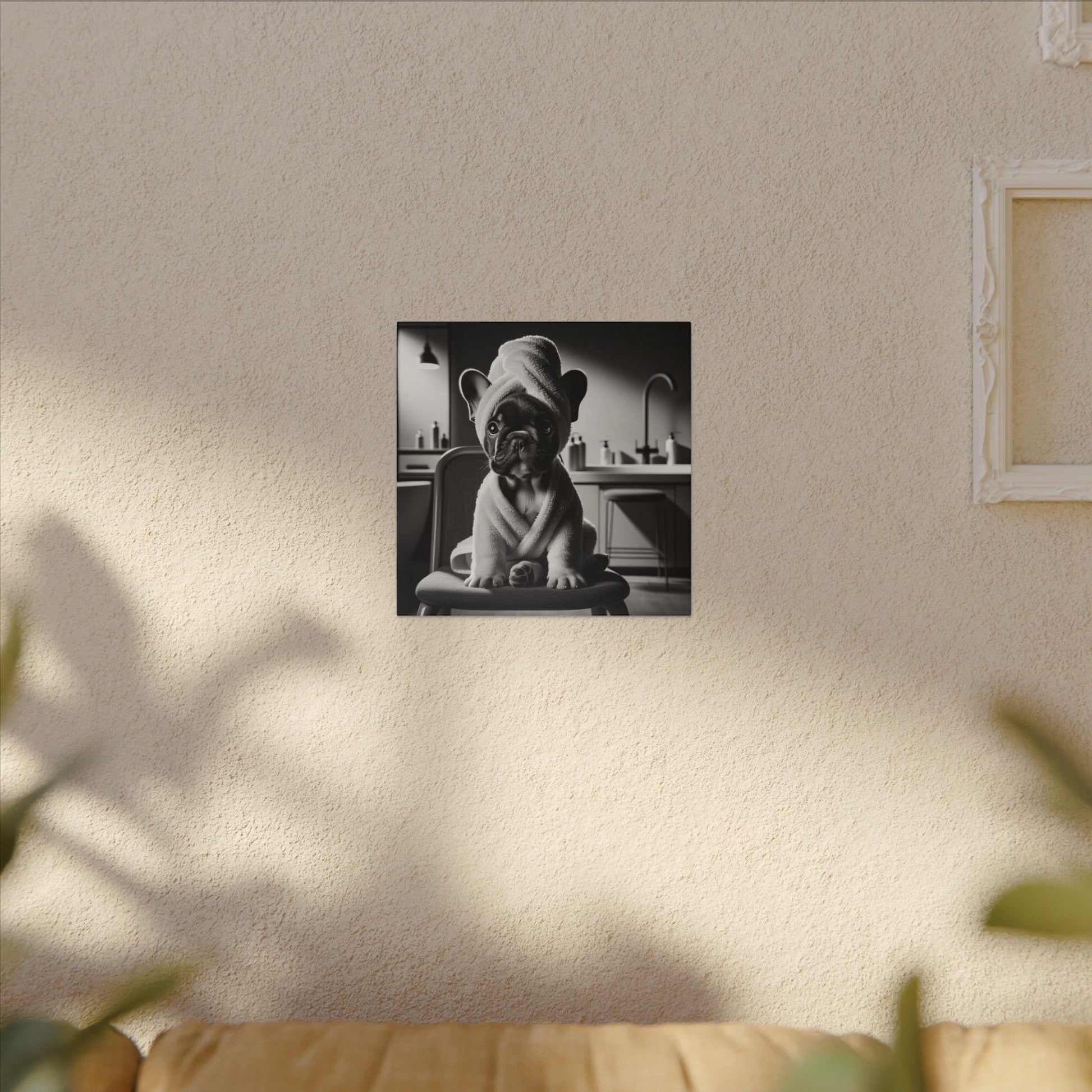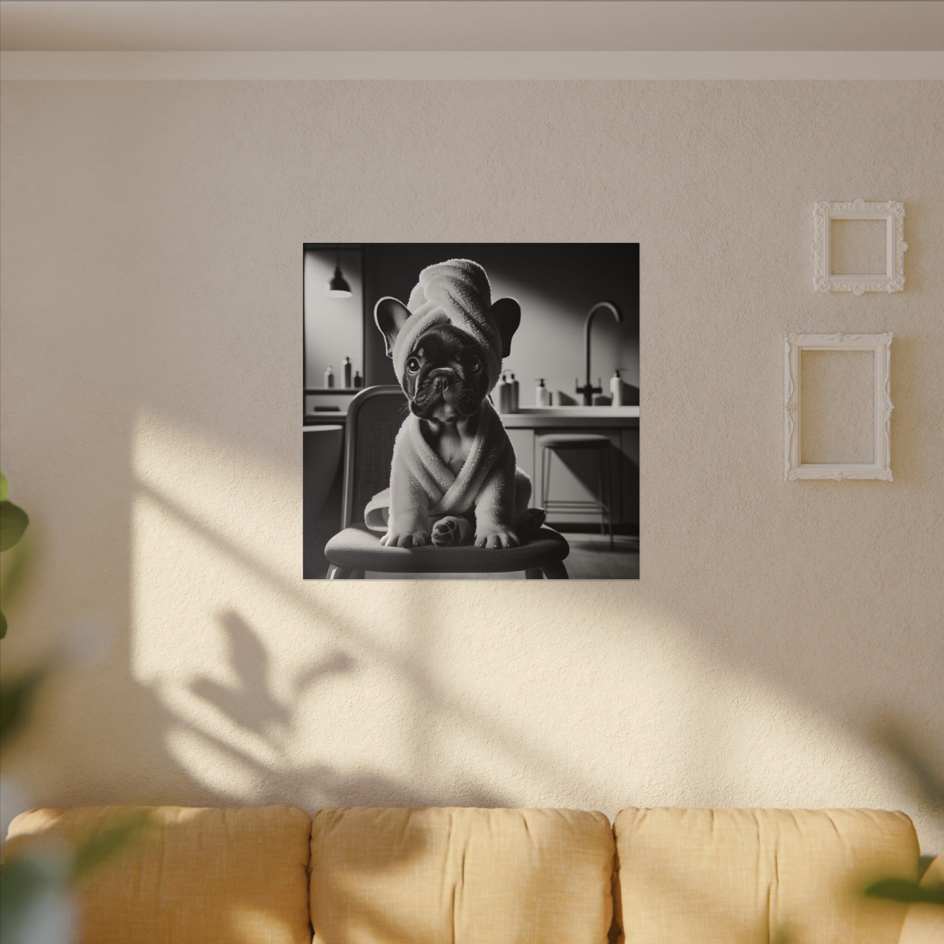 Add a touch of luxury to your home decor with this black and white French bulldog canvas print, featuring the pampered pup in a spa-like setting with a towel wrapped around its head. Perfect for dog lovers and those who appreciate whimsical and adorable art pieces. Ideal for adding a playful yet sophisticated touch to your bathroom or any room in your house. Great for dog lovers, pet owners, and those looking to add a unique statement piece to their home decor. Perfect for birthdays, Christmas, housewarmings, or any special occasion.
