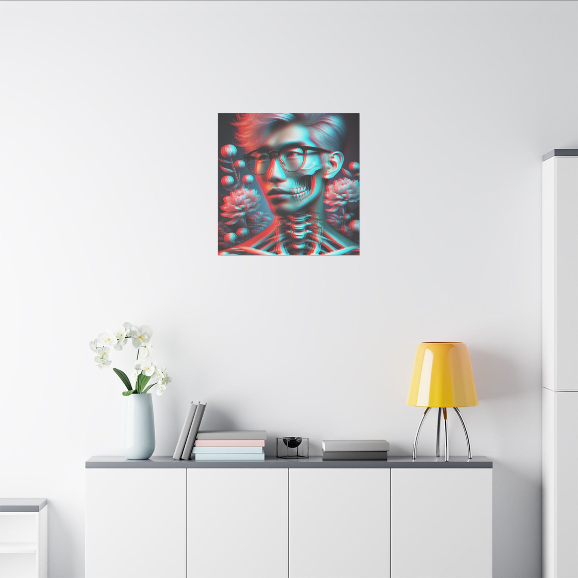 Unveil the ethereal beauty of this surreal anaglyph portrait—where a luminous skeletal form glows through a transparent body, enveloped in bold red and cyan hues. Expressive eyes captivate, framed by delicate flowers in a dreamlike dance of color and emotion.