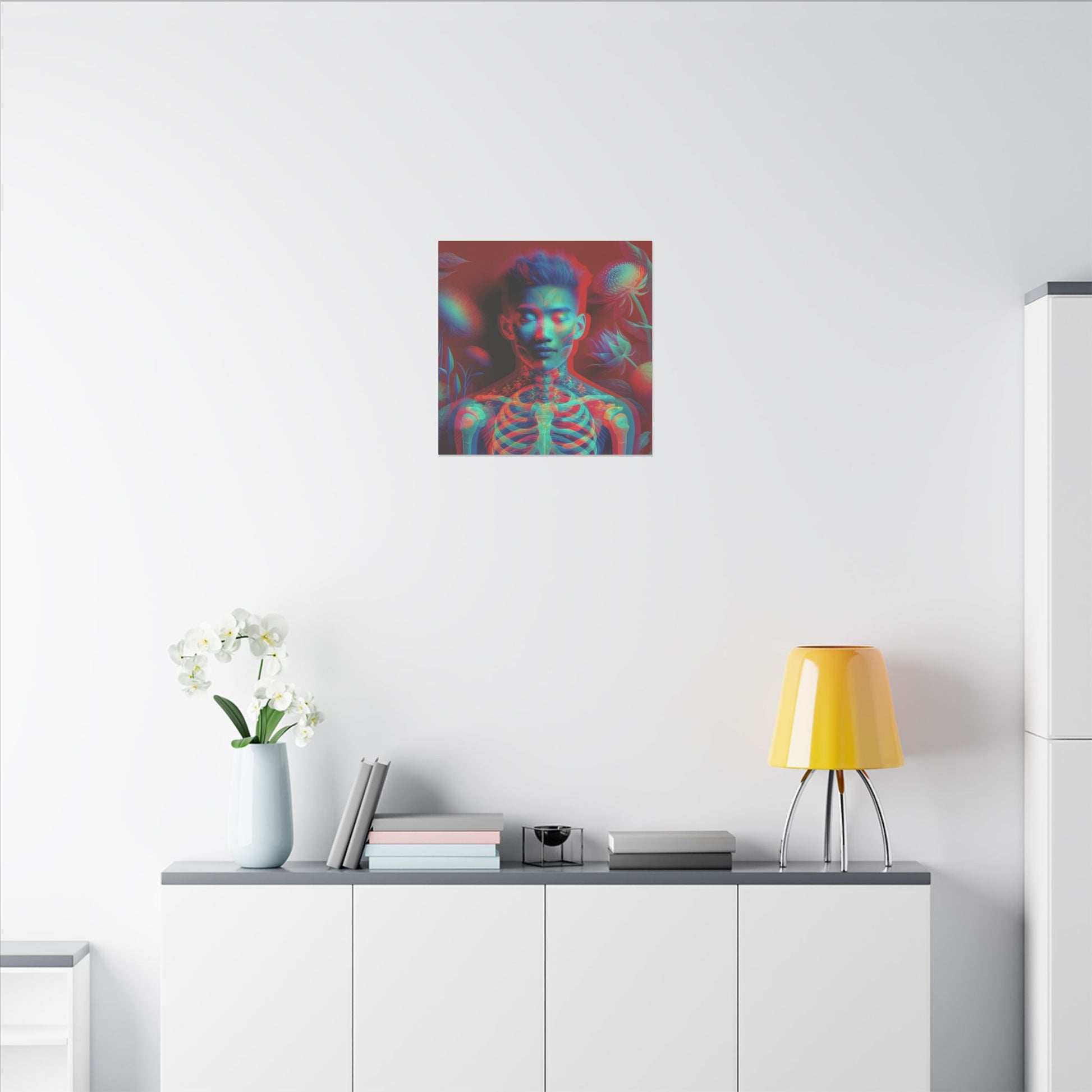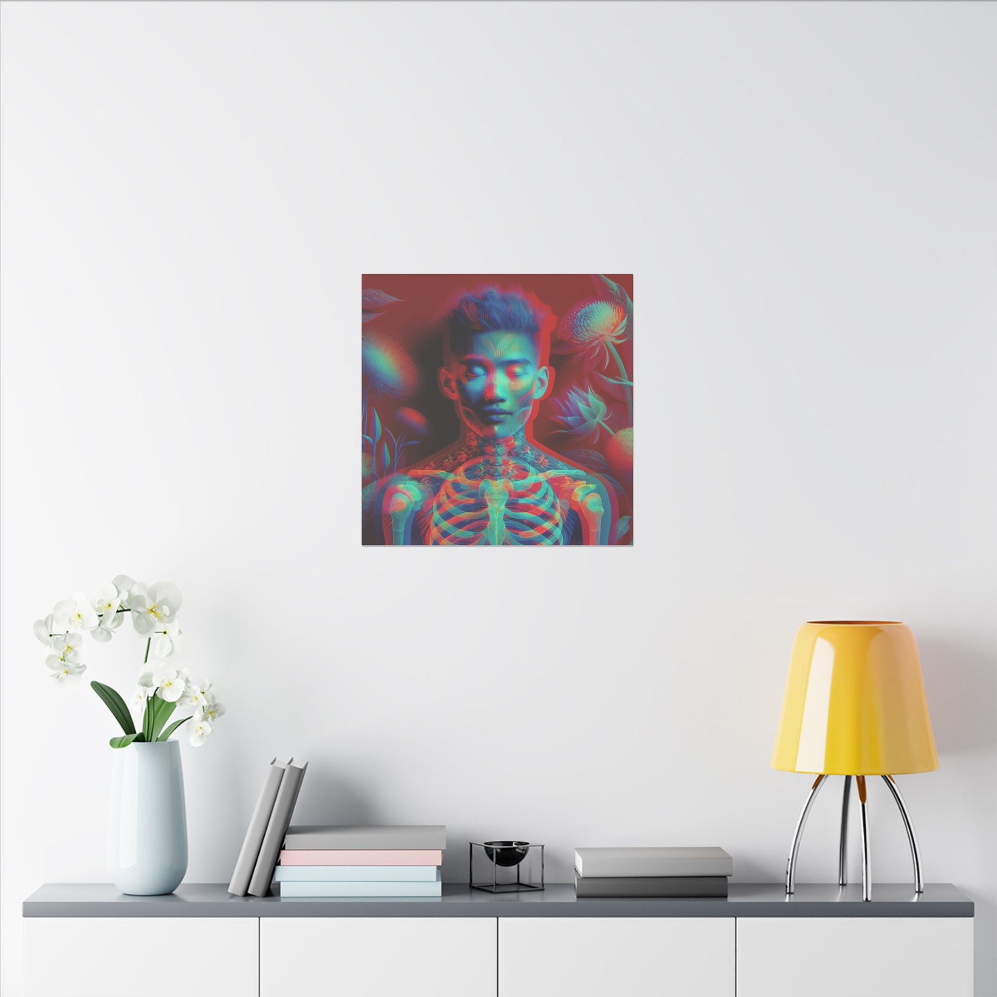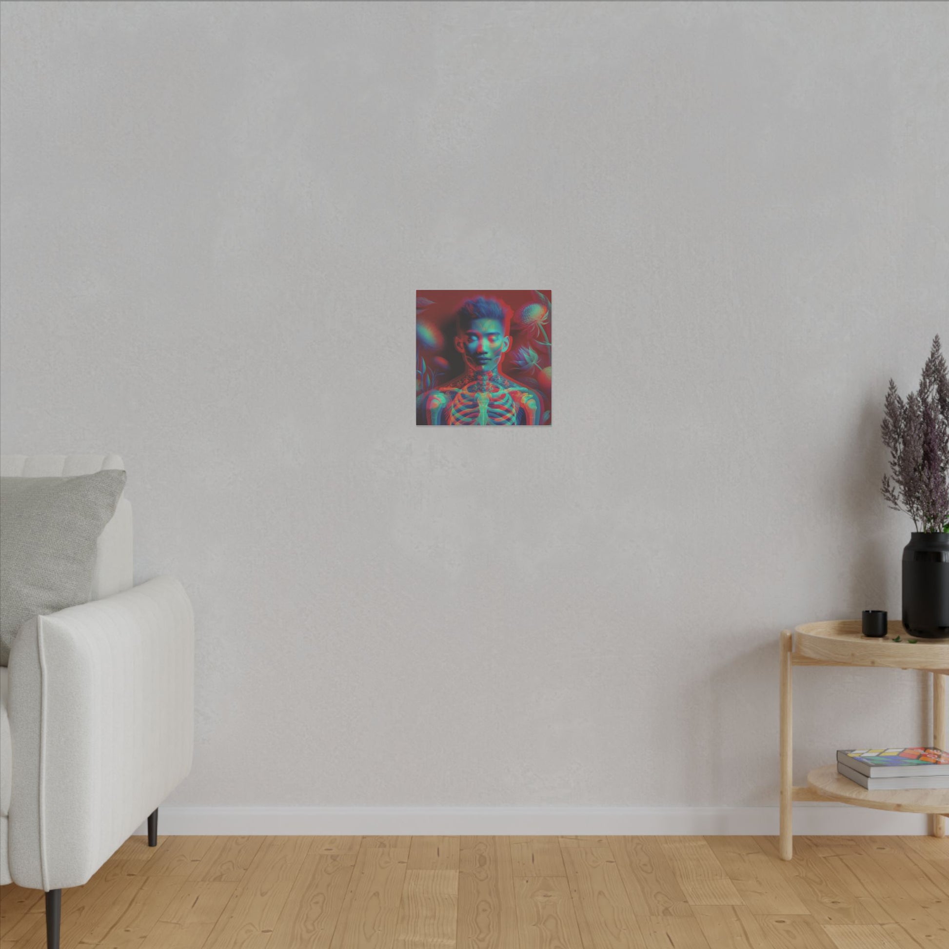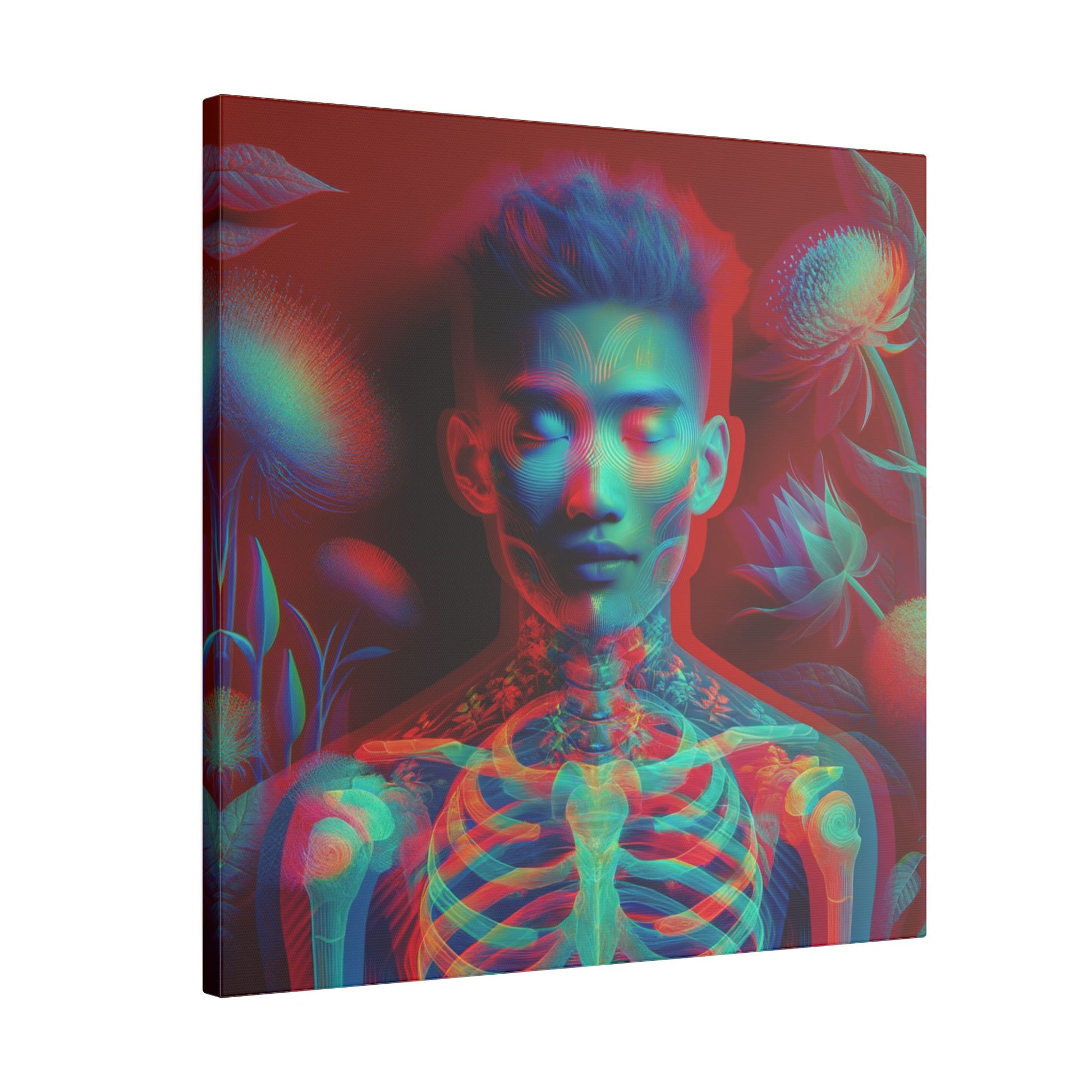 Immerse yourself in this mesmerizing anaglyph-style portrait, where a luminous skeletal structure glows through a transparent form. Vivid red and cyan hues intertwine with ethereal flowers, creating a dreamlike fusion of beauty and mystery. A stunning statement piece. #SurrealArt #Anaglyph #EtherealBeauty #CanvasArt #Dreamlike