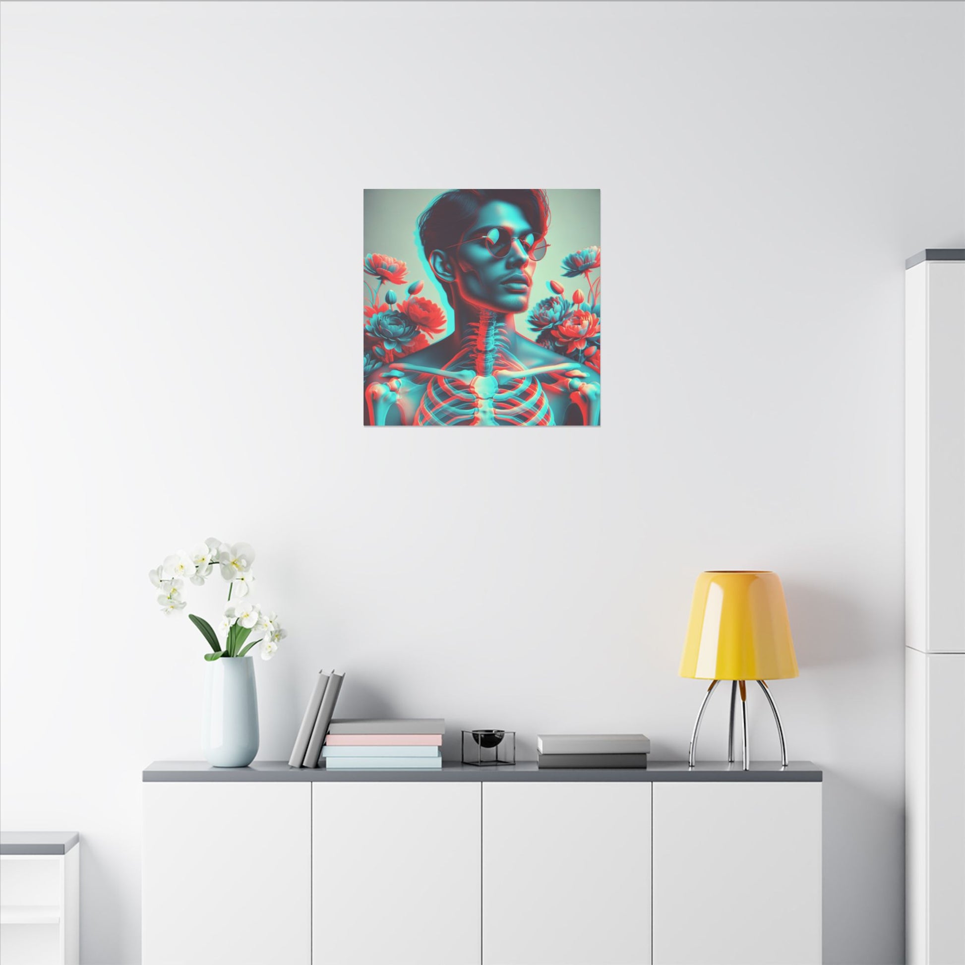 Unlock the surreal with this vibrant anaglyph-style portrait—where beauty meets the ethereal. A glowing skeletal form emerges beneath a transparent body, wrapped in bold red and cyan hues. Expressive eyes captivate as delicate flowers float around in dreamlike harmony.
