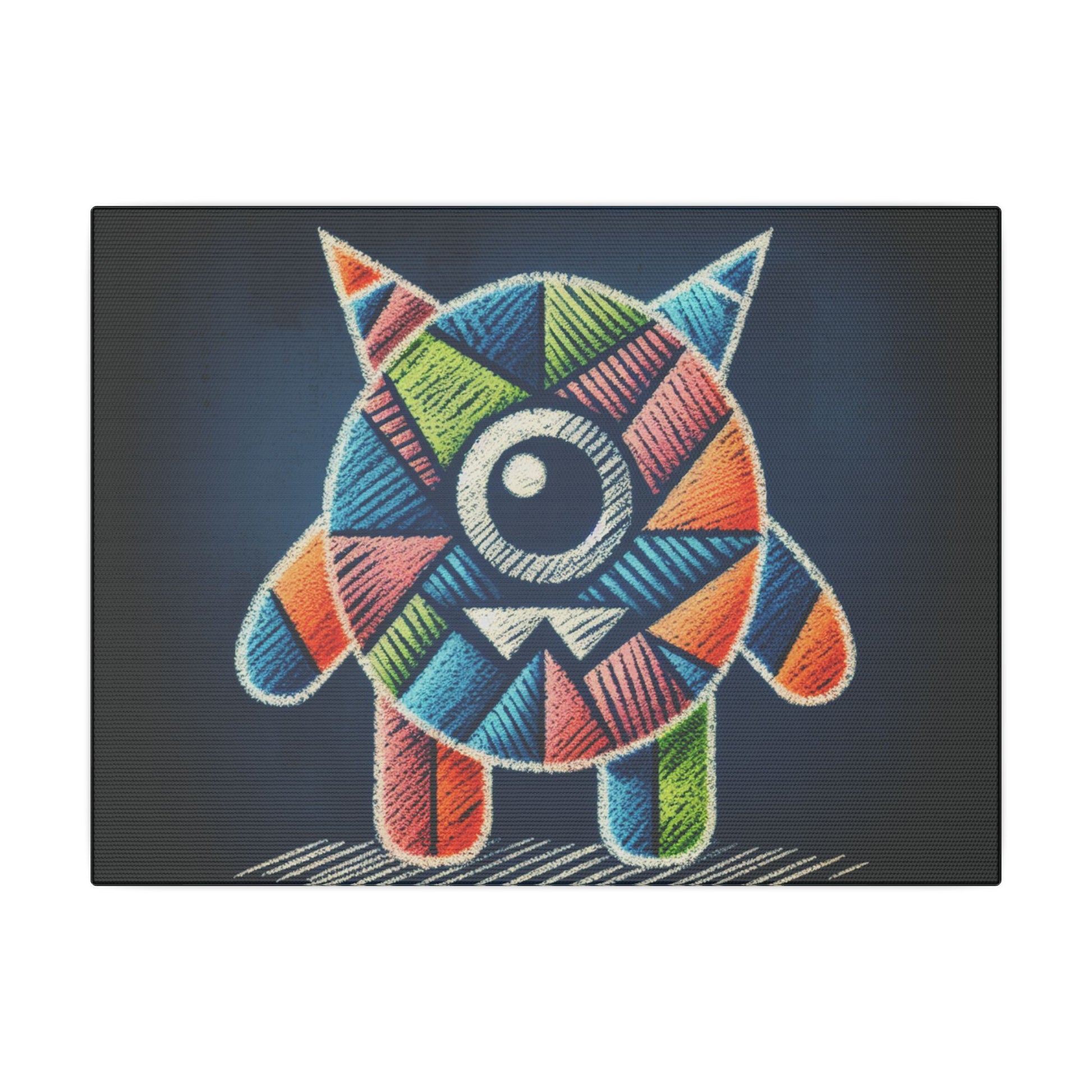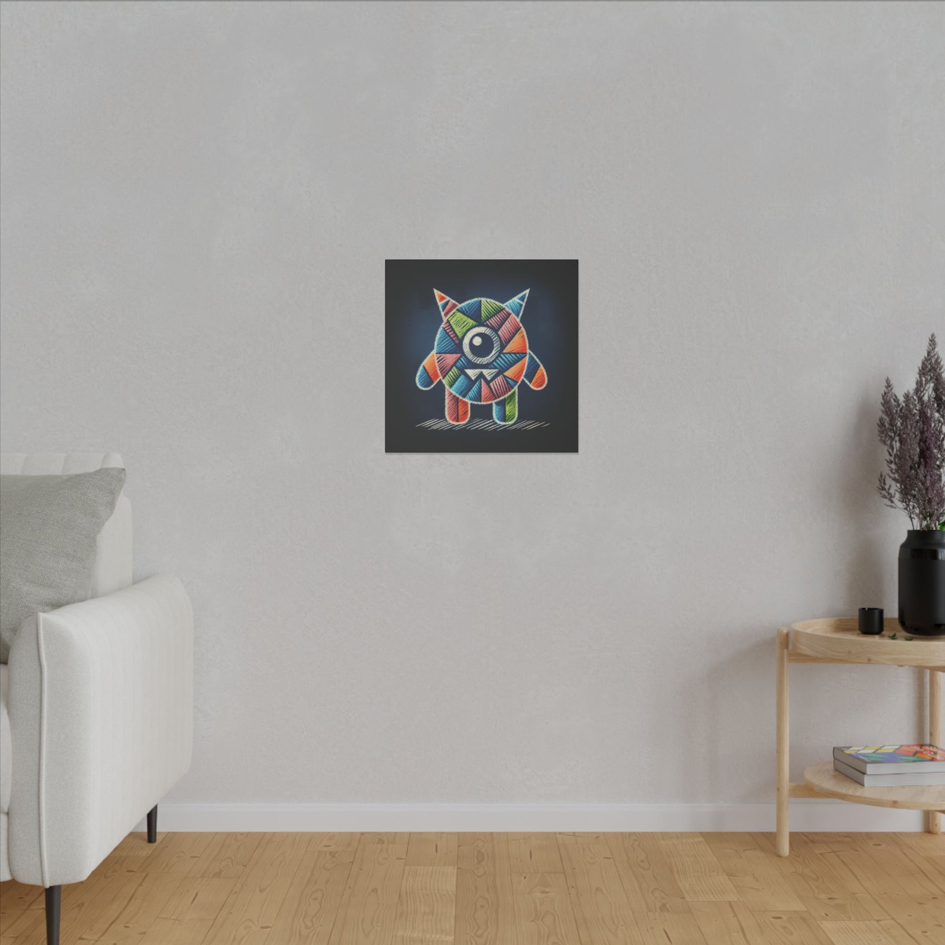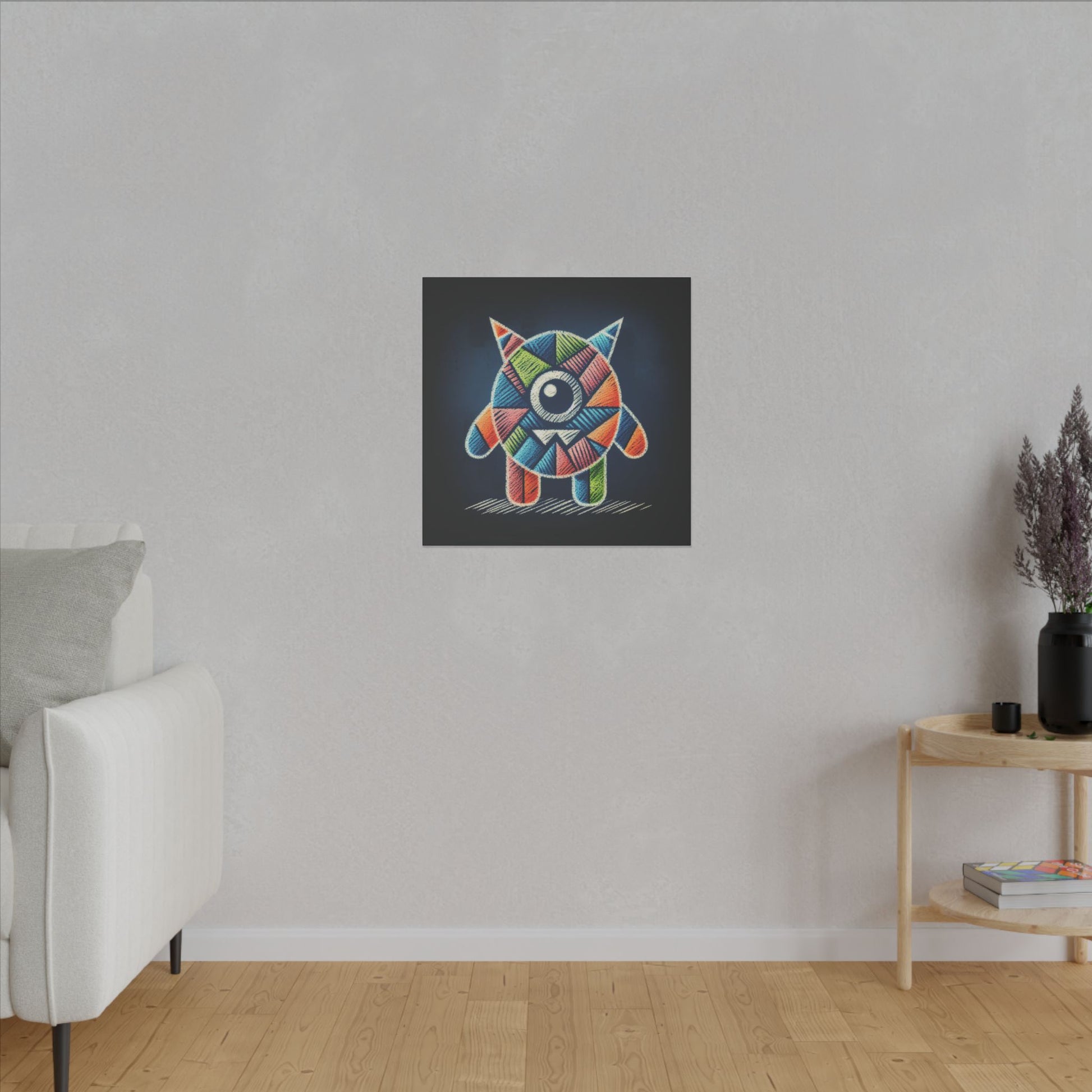 Add a touch of whimsy to your space with this adorable canvas featuring a crayon-textured drawing of a cute colorful monster with geometric bodies. The playful design is fully centered on a dark blue background, adding a pop of color to any room. Perfect for adding a fun and quirky vibe to your décor. Bring out your inner child with this charming piece!