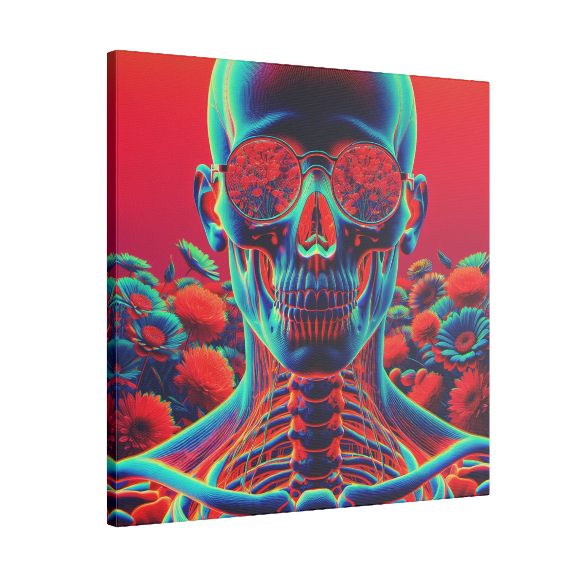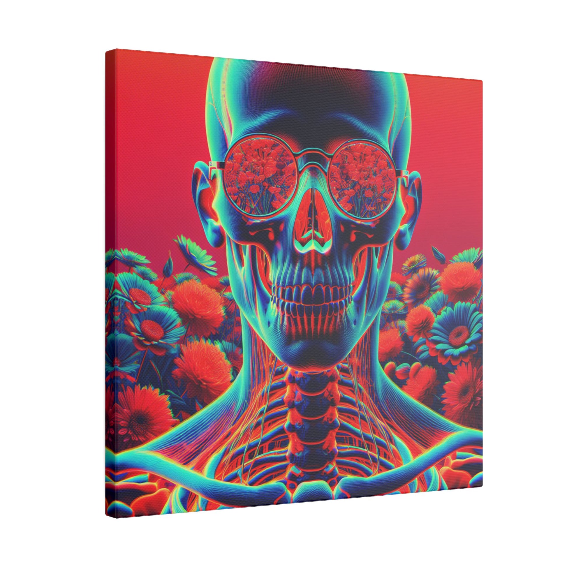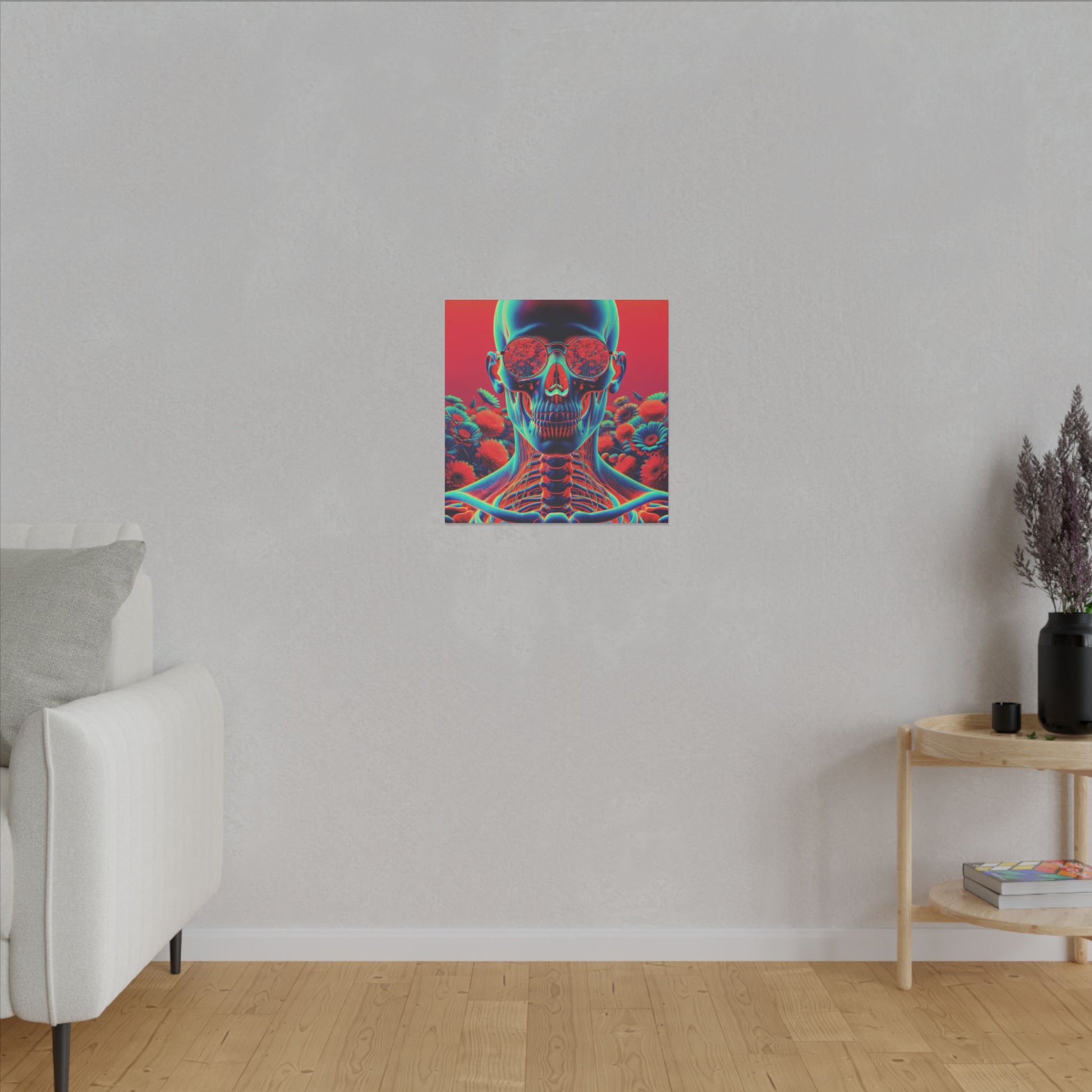 Bold anaglyph art: surreal transparent human form with visible skeleton, vibrant red-cyan hues, and intricate flowers. Clear face & eyes radiate life in stunning detail. #AnaglyphArt #CanvasDesign #SurrealArt #ModernArt #BoldDecor