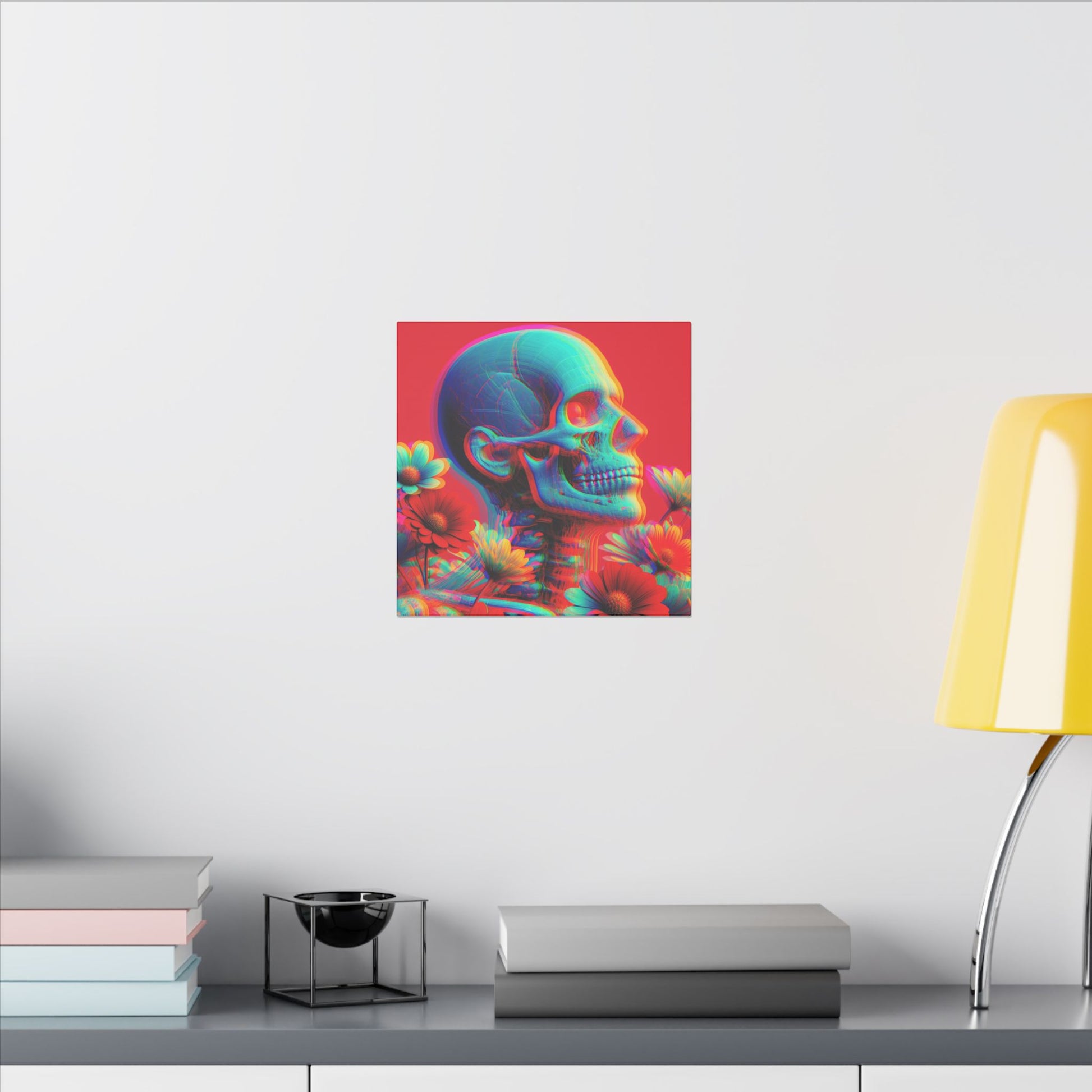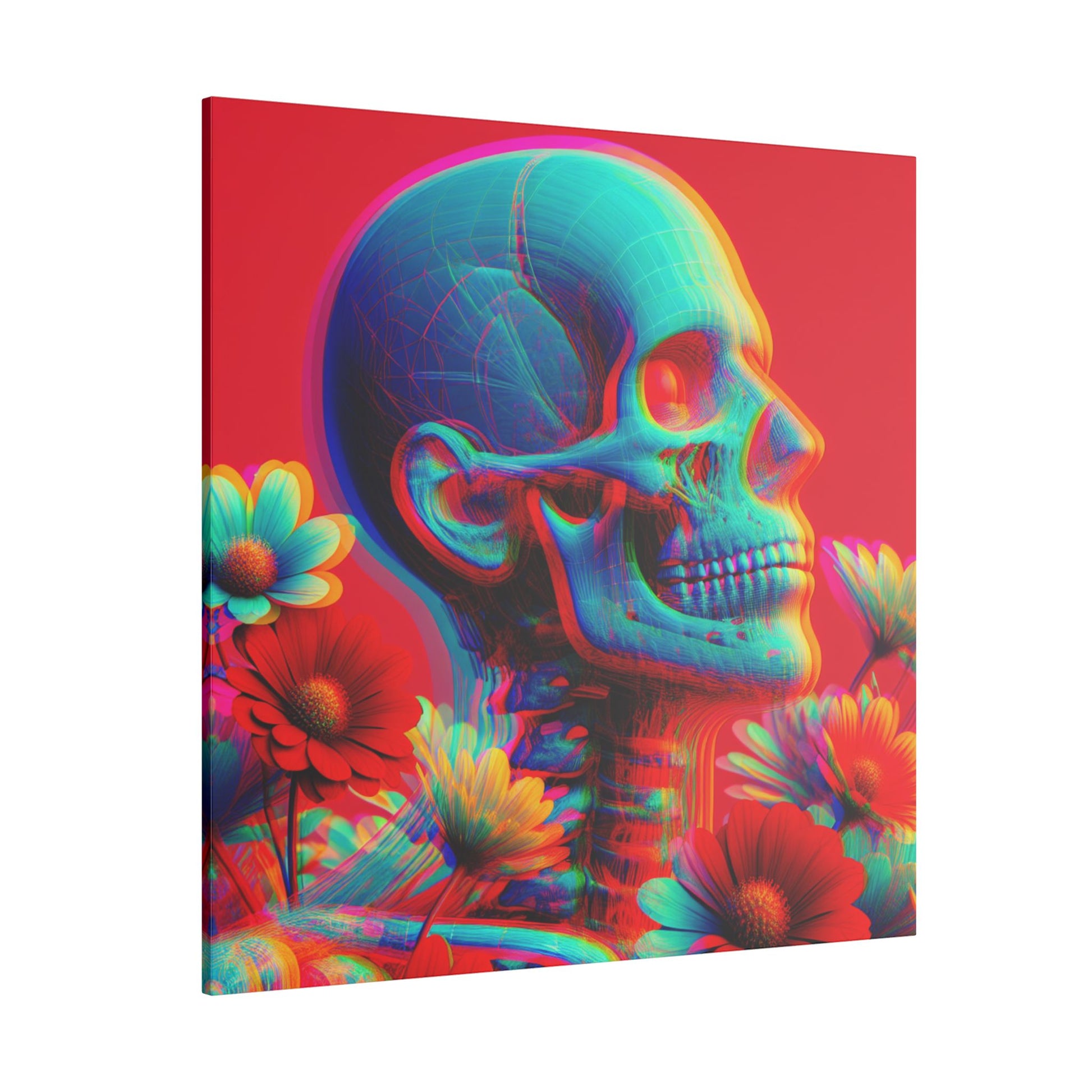 Bold anaglyph art: a surreal human figure with a transparent body, skeletal details, vibrant red & cyan hues, and delicate flowers. Eye-catching & high-res. #SurrealArt #Anaglyph #CanvasDecor #ModernArt #WallAesthetics