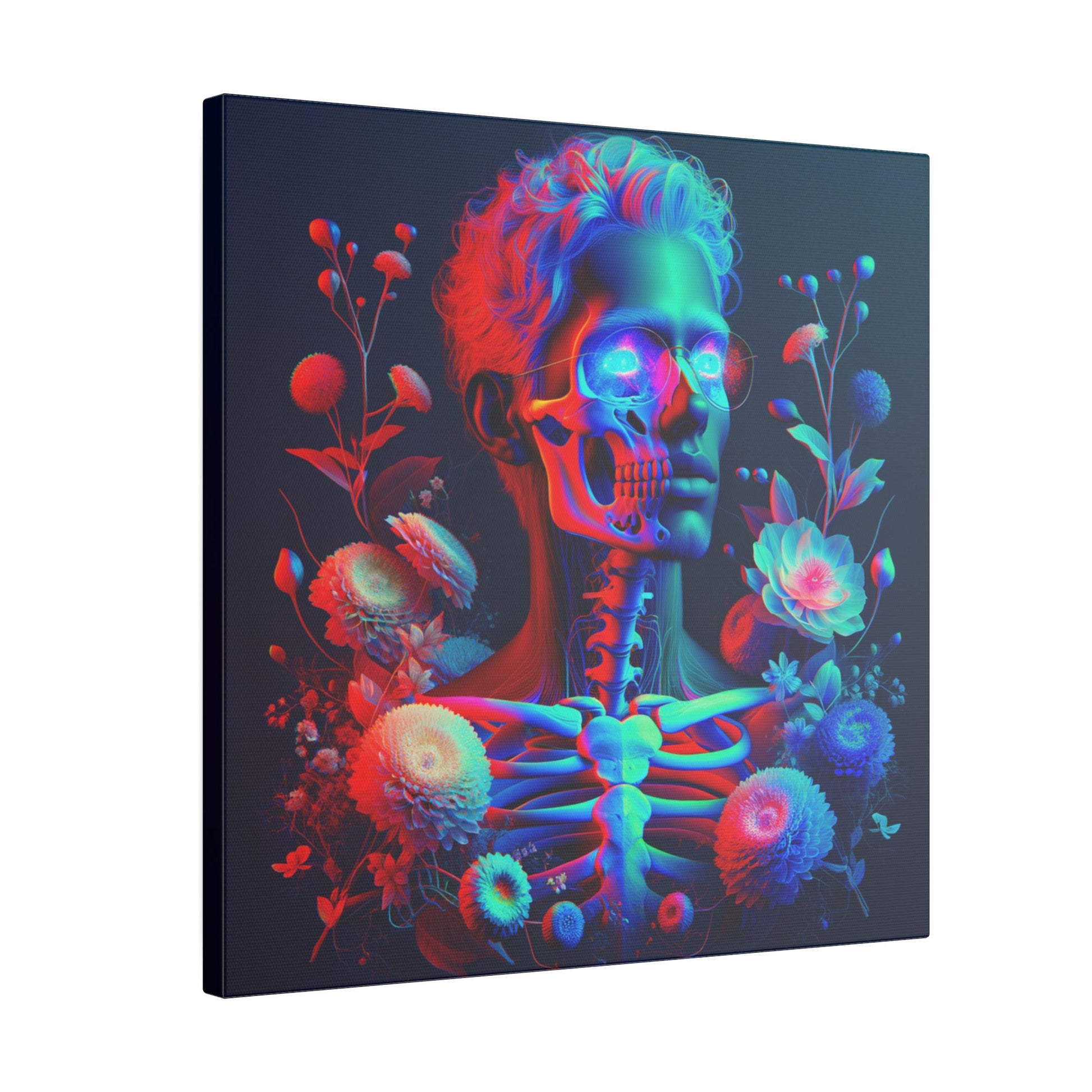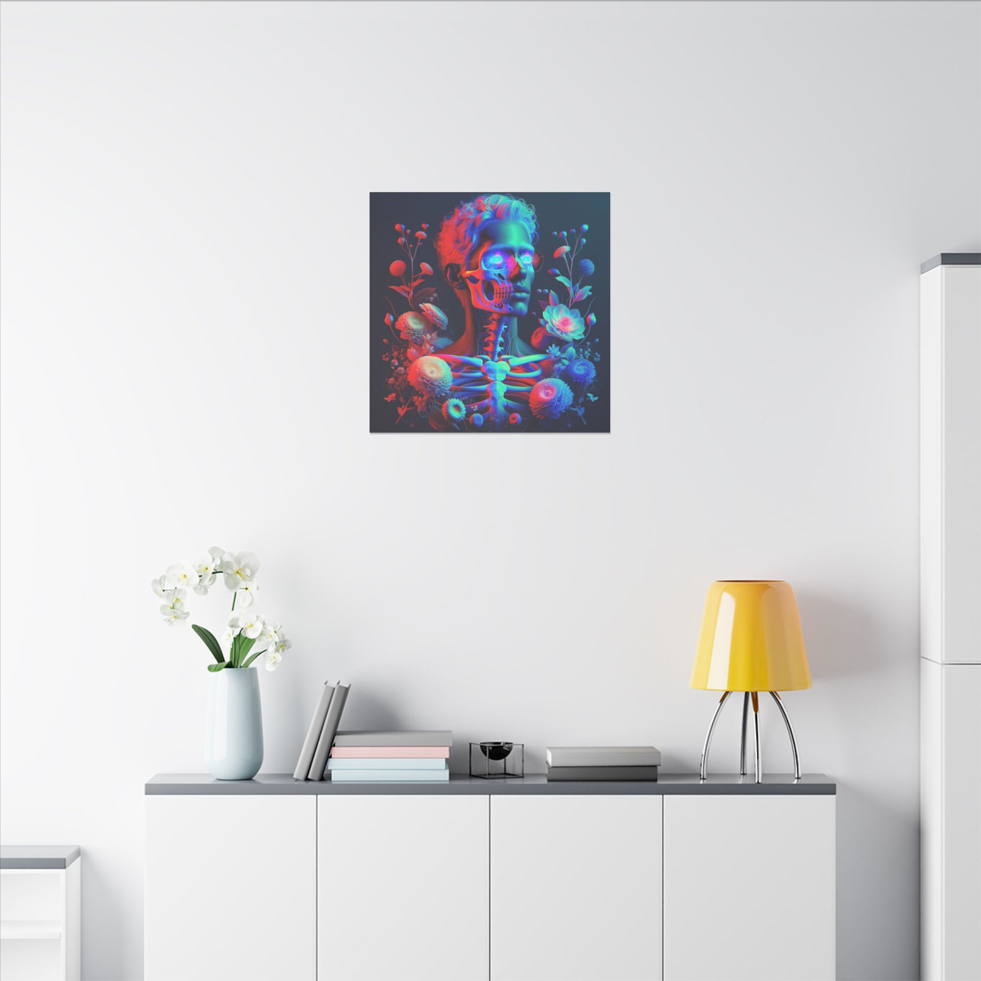 Unveil the unseen with this mesmerizing anaglyph-style portrait. A glowing skeletal form emerges through a transparent body, blending seamlessly with bold red and cyan hues. Ethereal flowers surround expressive eyes, evoking a dreamlike allure that captivates any space.