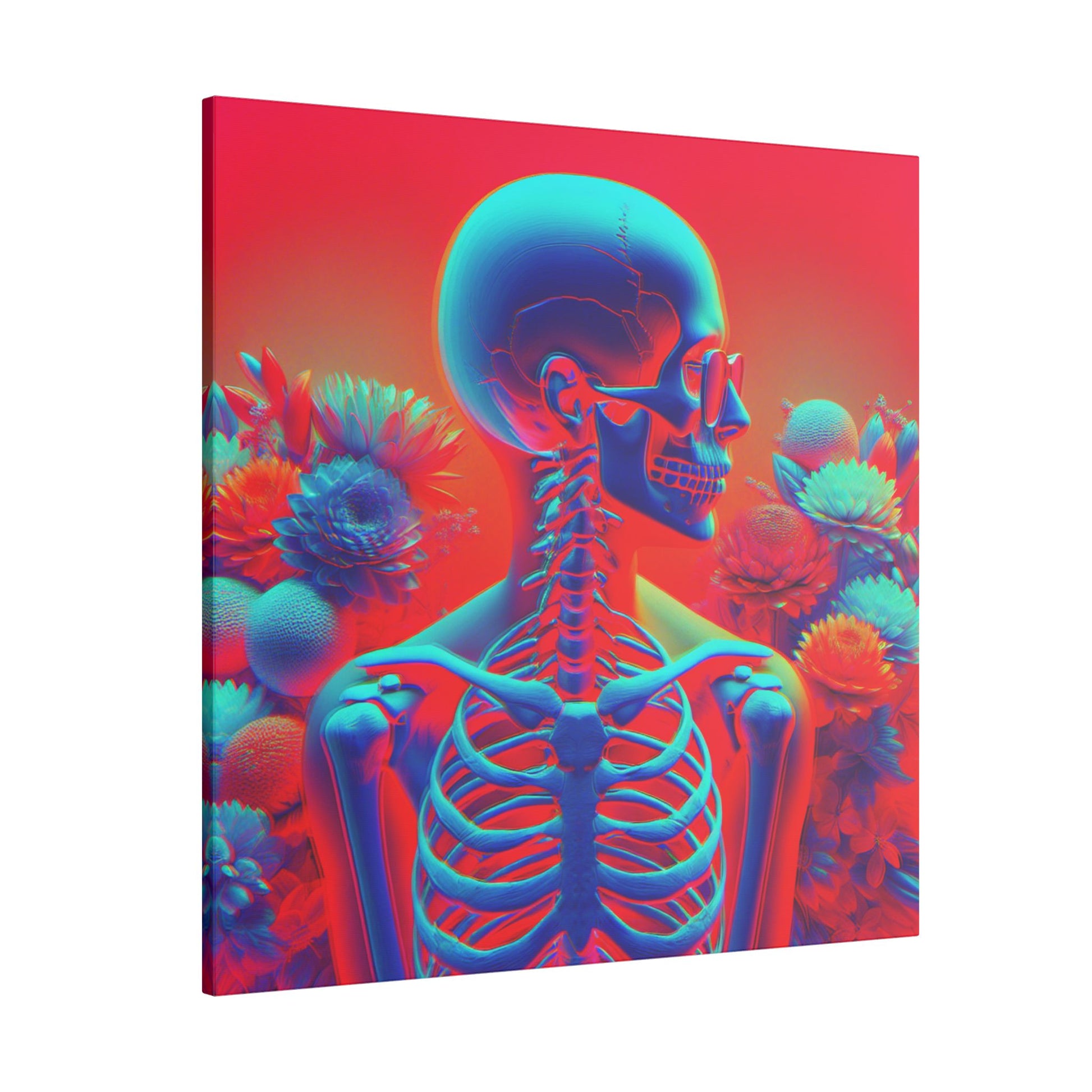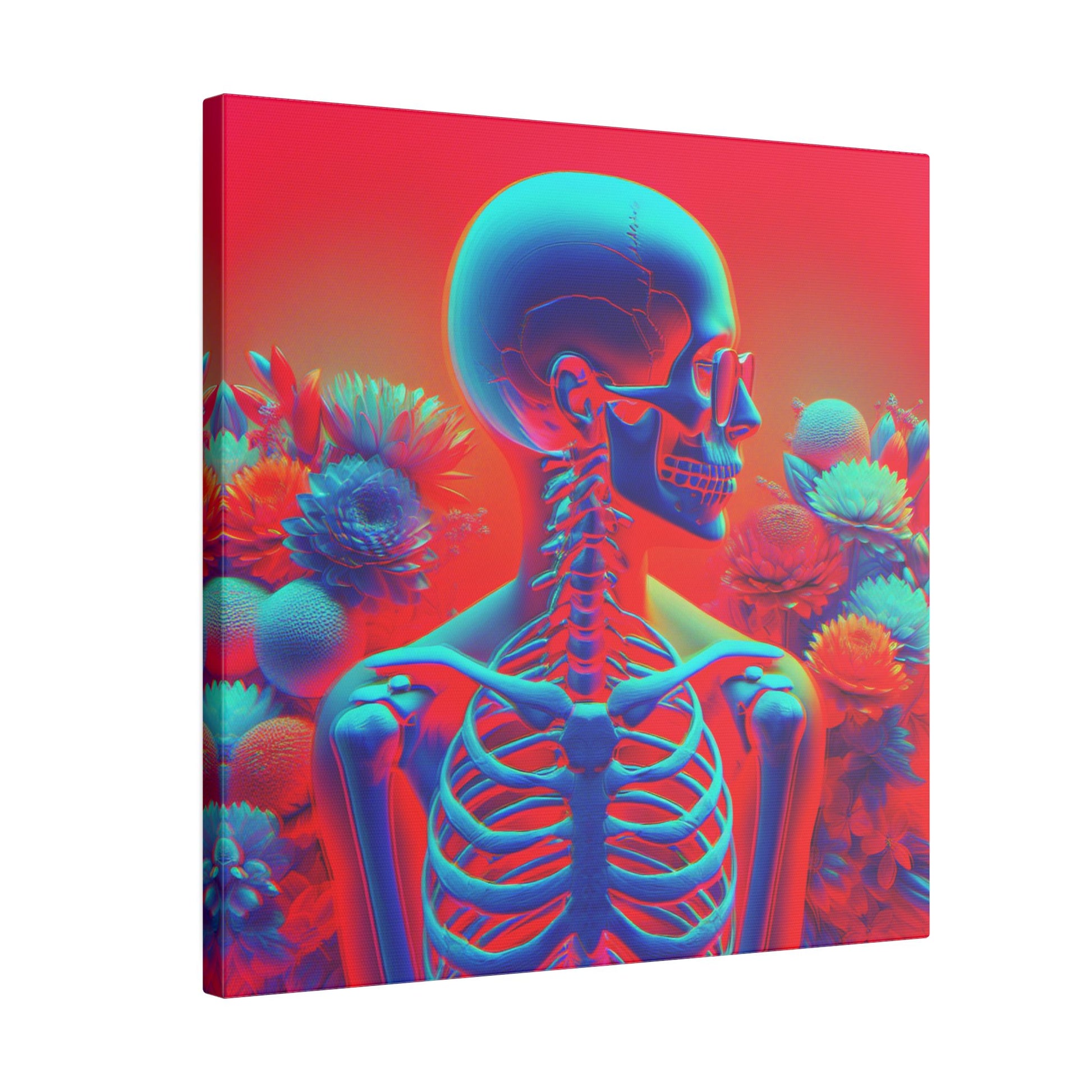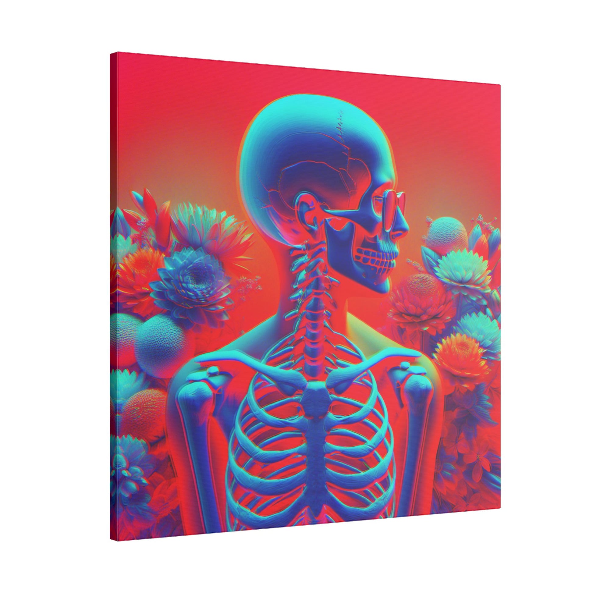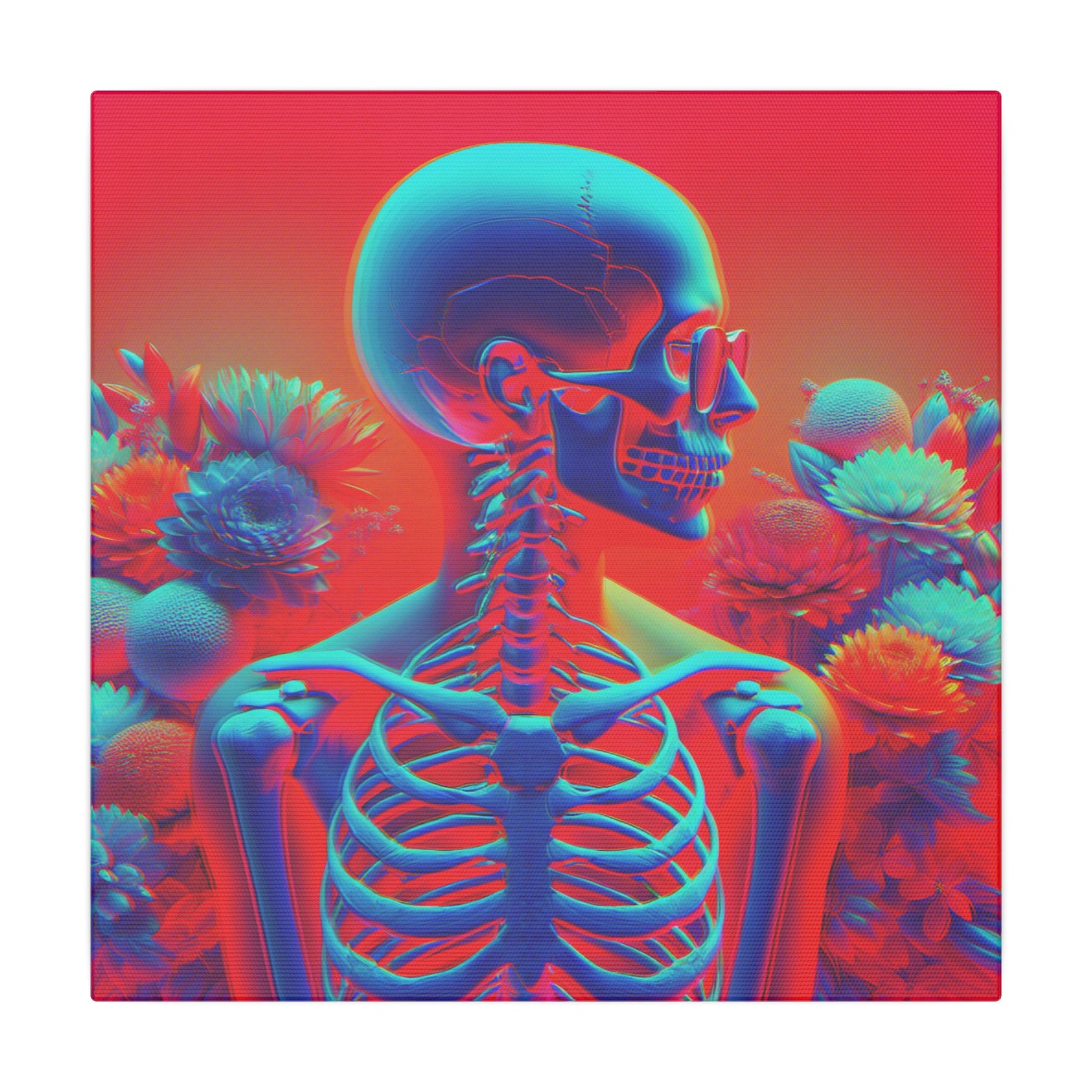 Bold & surreal anaglyph canvas showcasing a transparent human form with visible skeleton, vibrant red-cyan hues, and delicate flowers. A striking fusion of anatomy & beauty. #SurrealArt #Anaglyph #CanvasArt #HumanForm #VibrantDesign