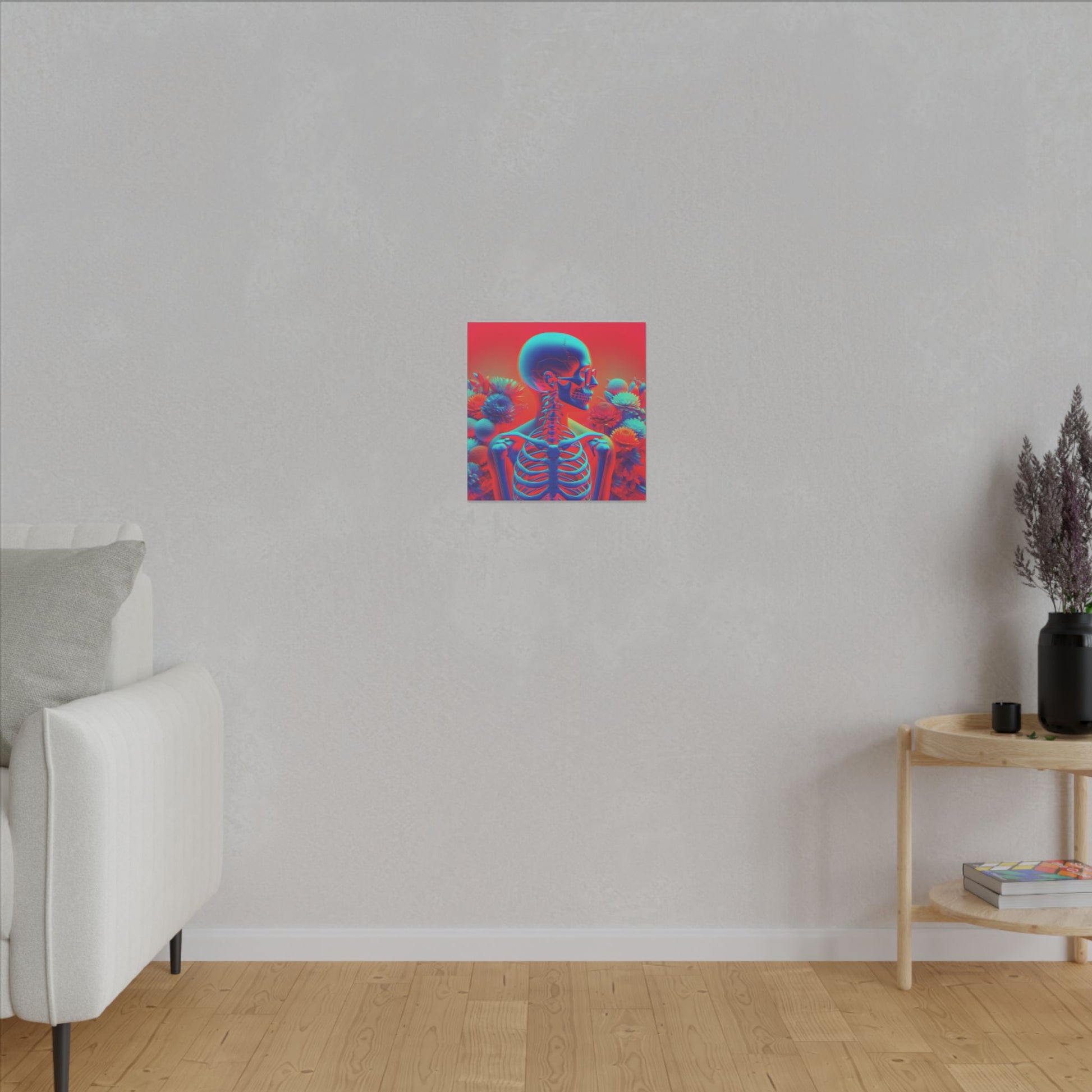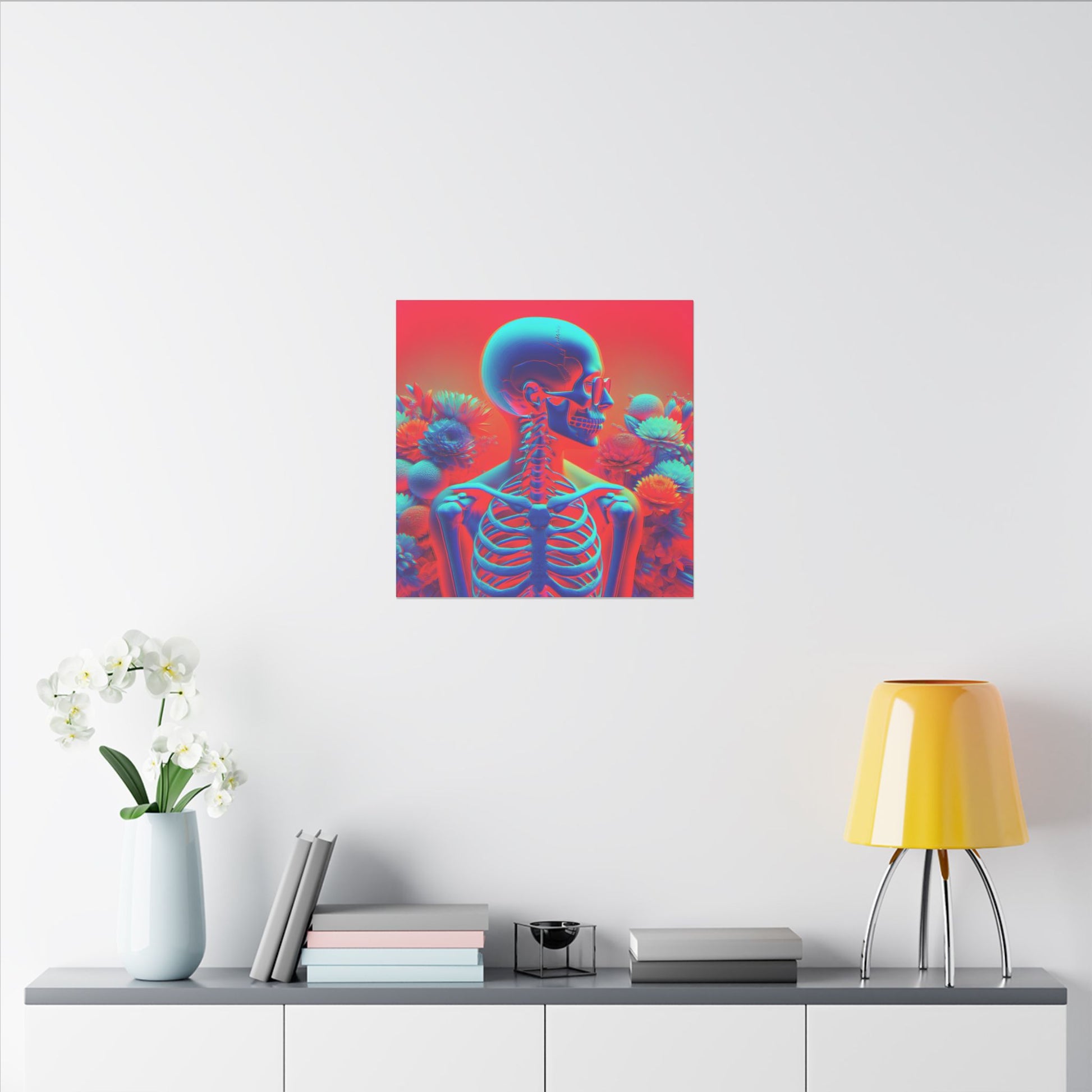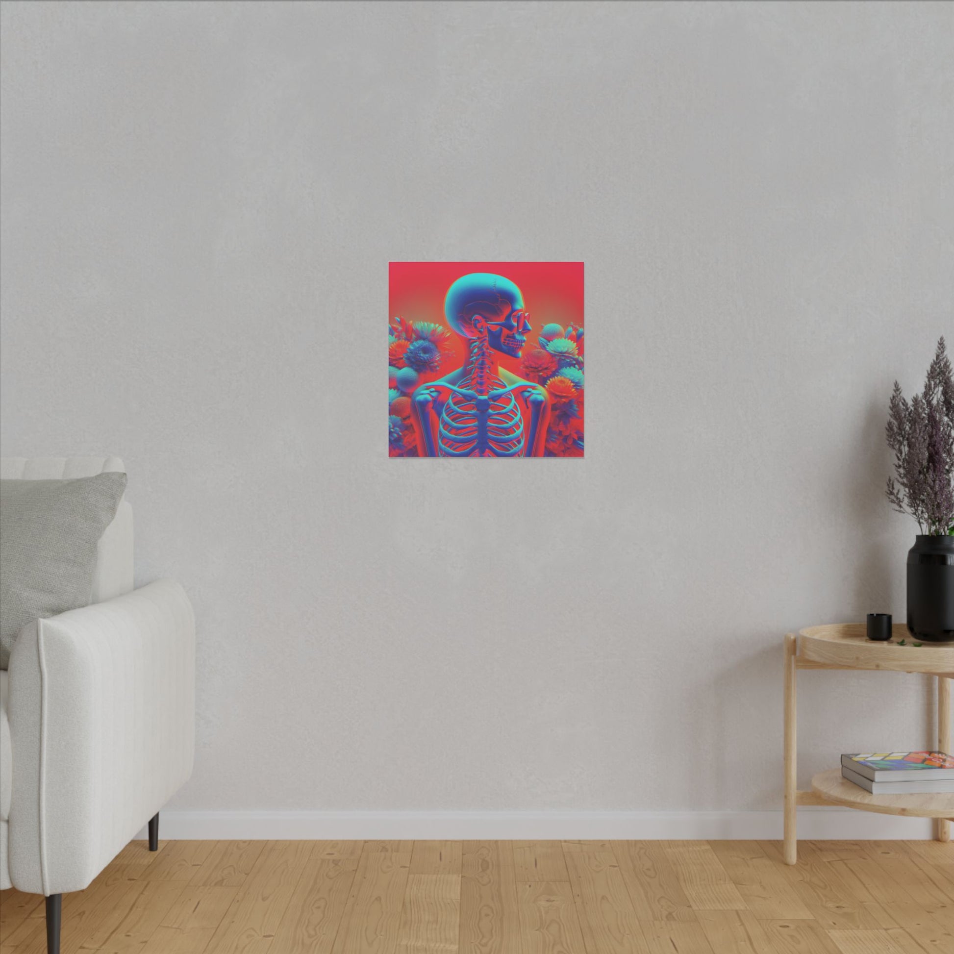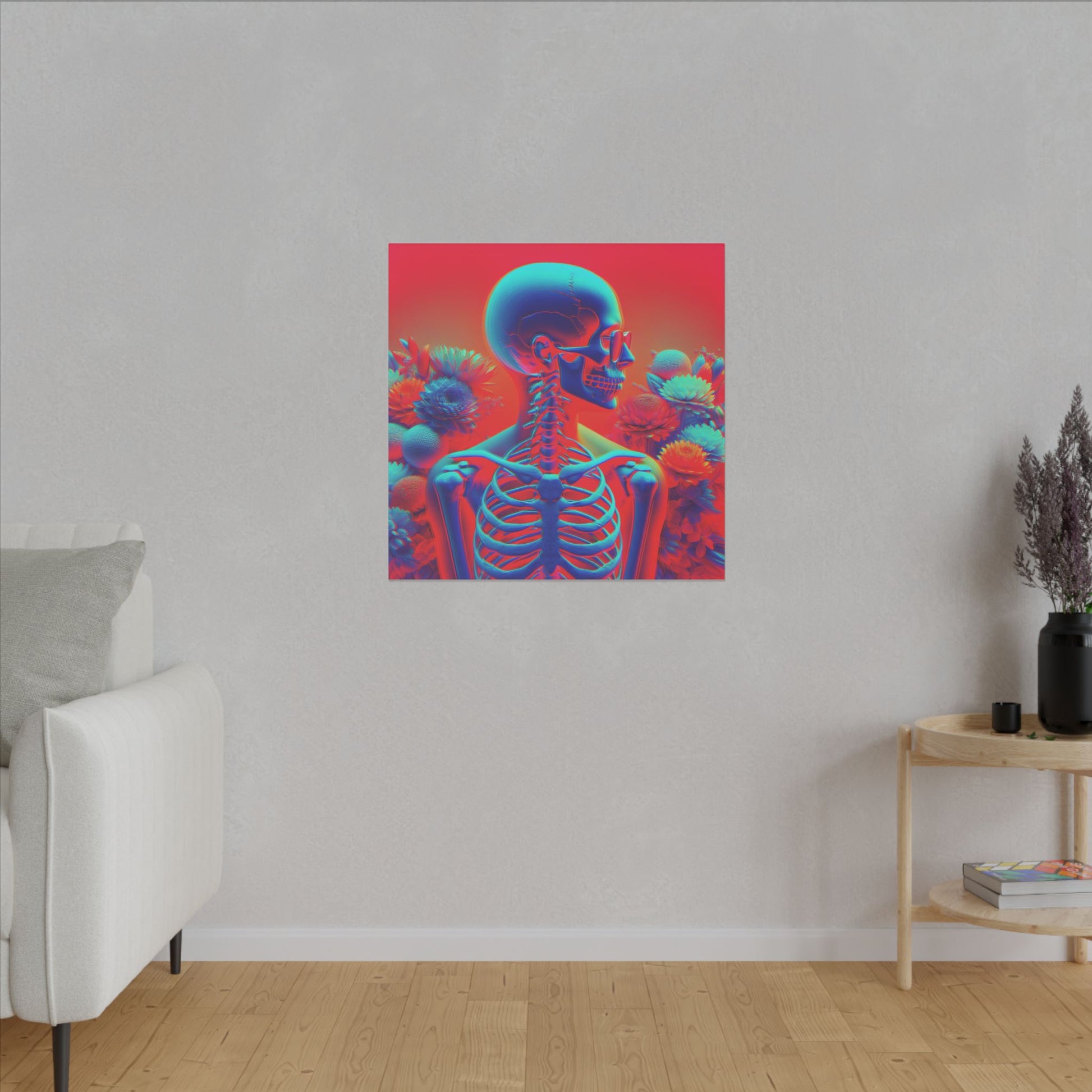 Bold & surreal anaglyph canvas showcasing a transparent human form with visible skeleton, vibrant red-cyan hues, and delicate flowers. A striking fusion of anatomy & beauty. #SurrealArt #Anaglyph #CanvasArt #HumanForm #VibrantDesign