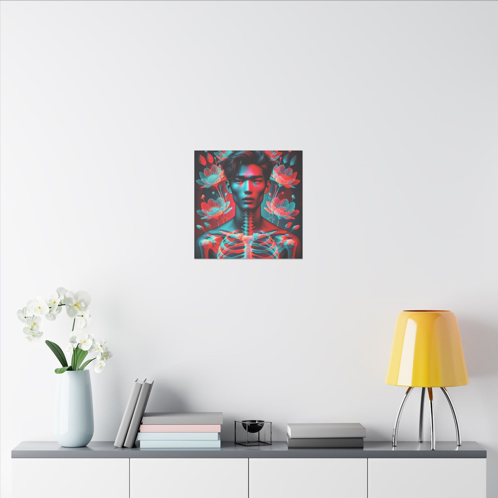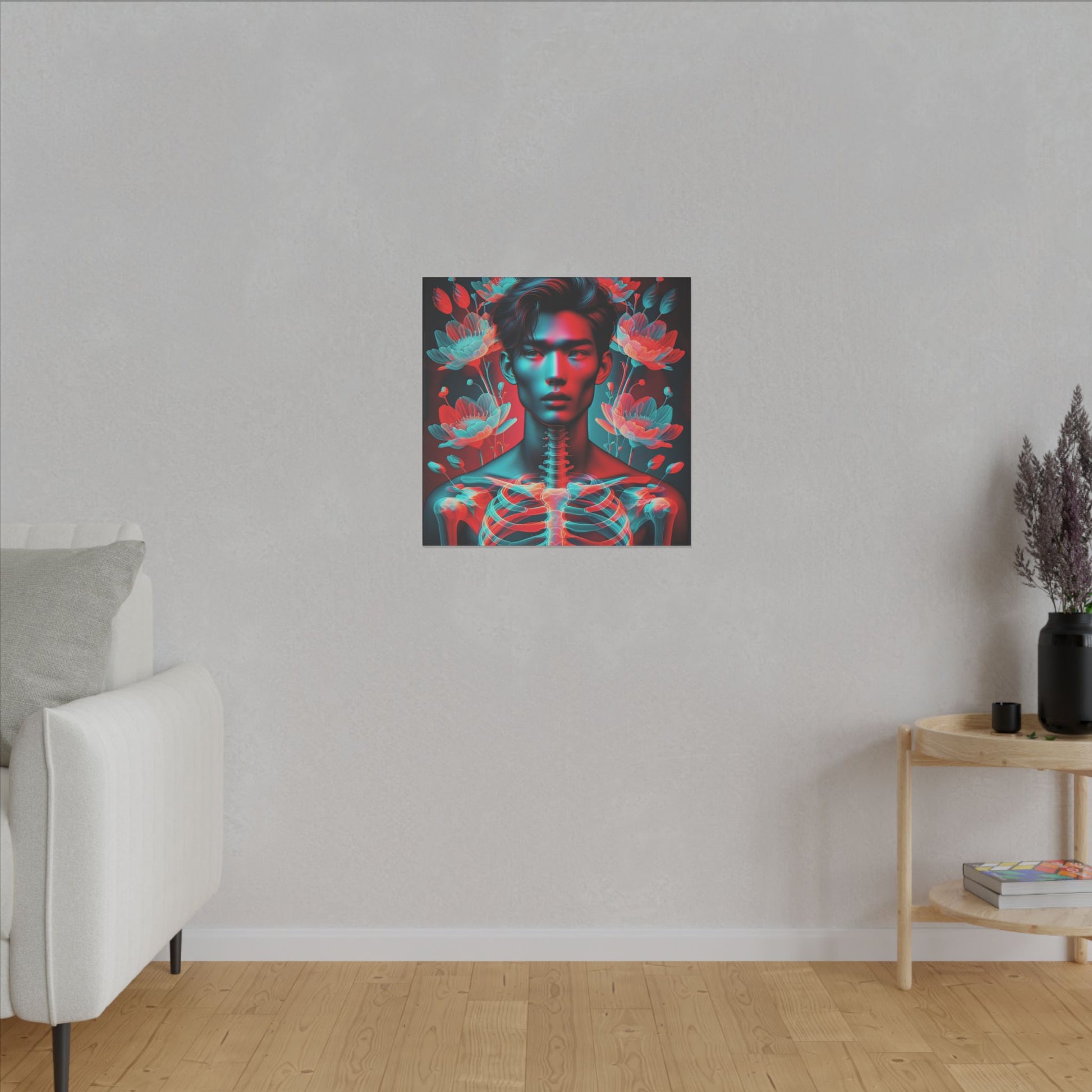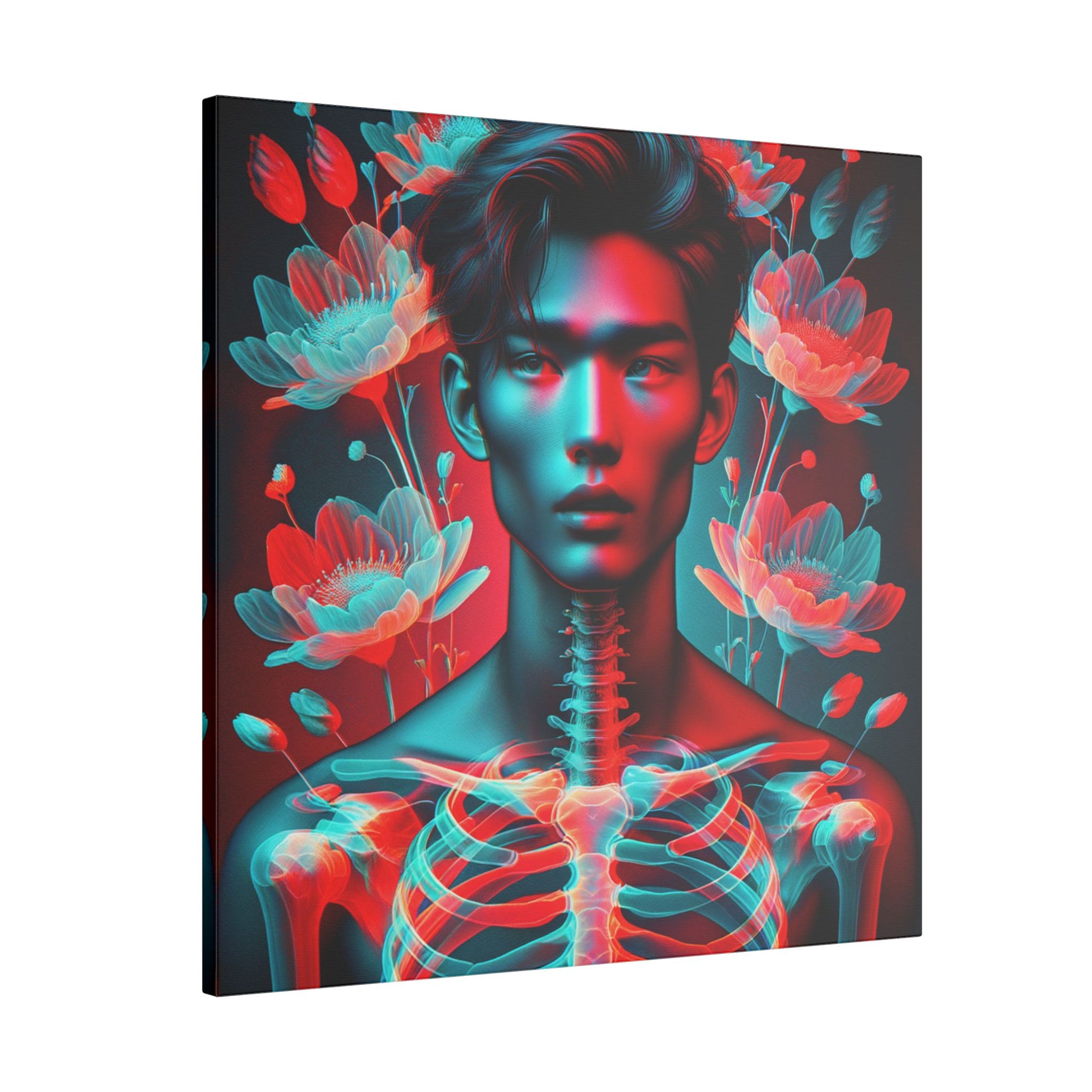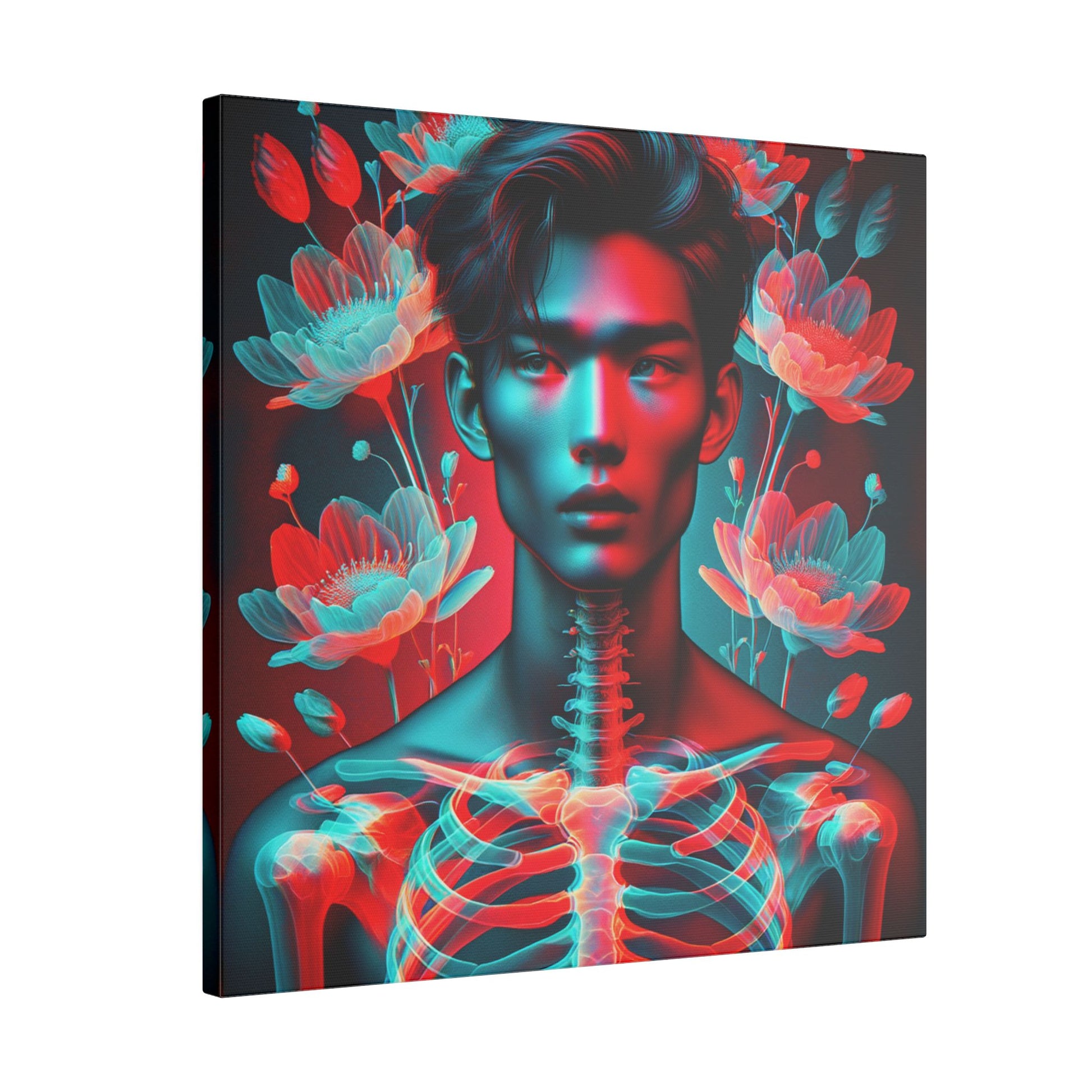 A mesmerizing anaglyph-style portrait blending a glowing skeletal form with vivid red and cyan hues. Expressive eyes captivate as delicate, dreamlike flowers surround the figure, creating a surreal yet emotive masterpiece. A stunning fusion of beauty and mystery. #SurrealArt #Anaglyph #CanvasPrint #EtherealBeauty #ModernDecor