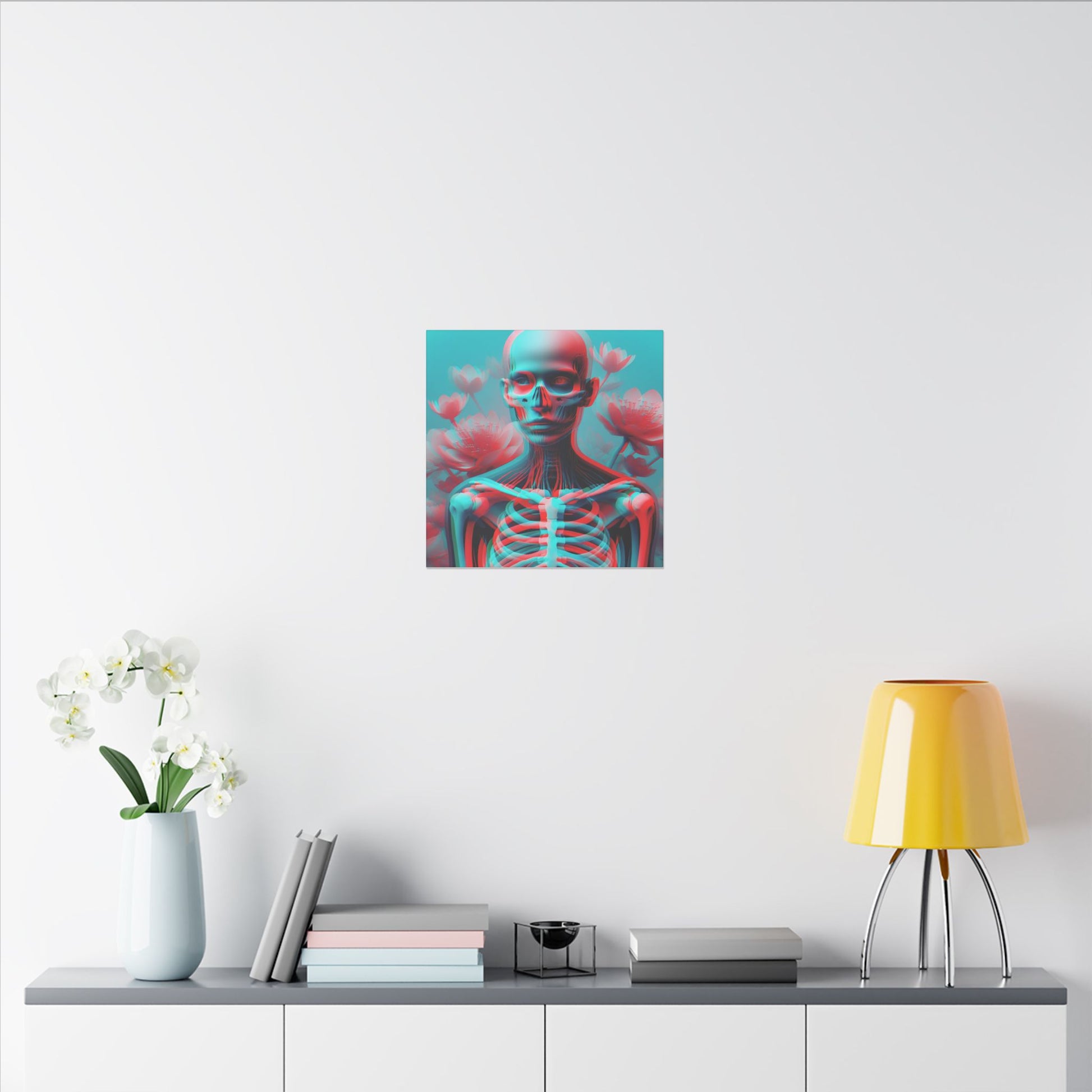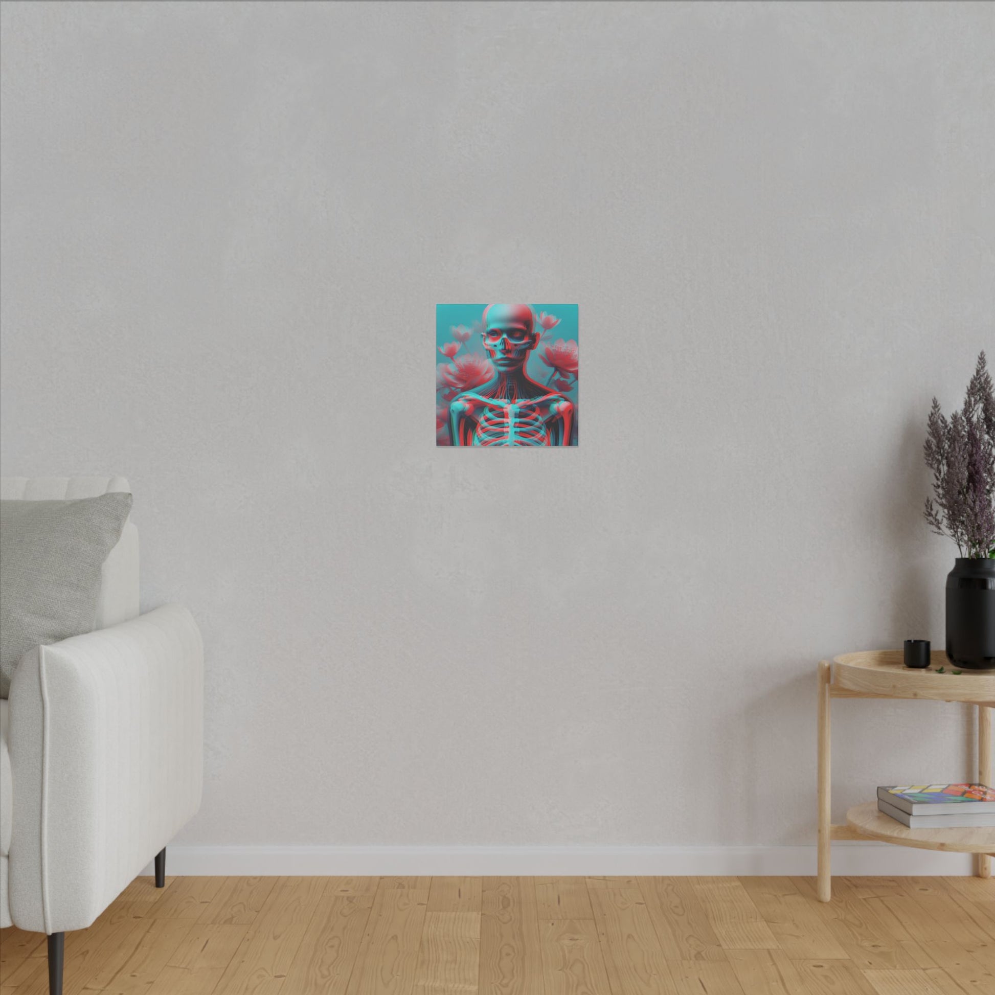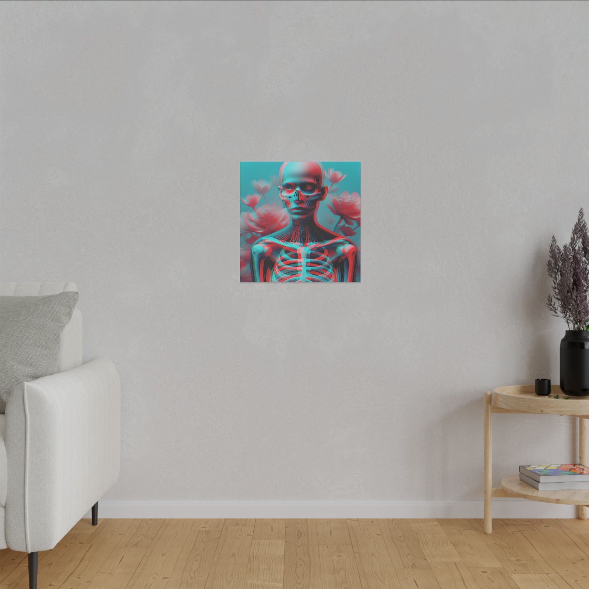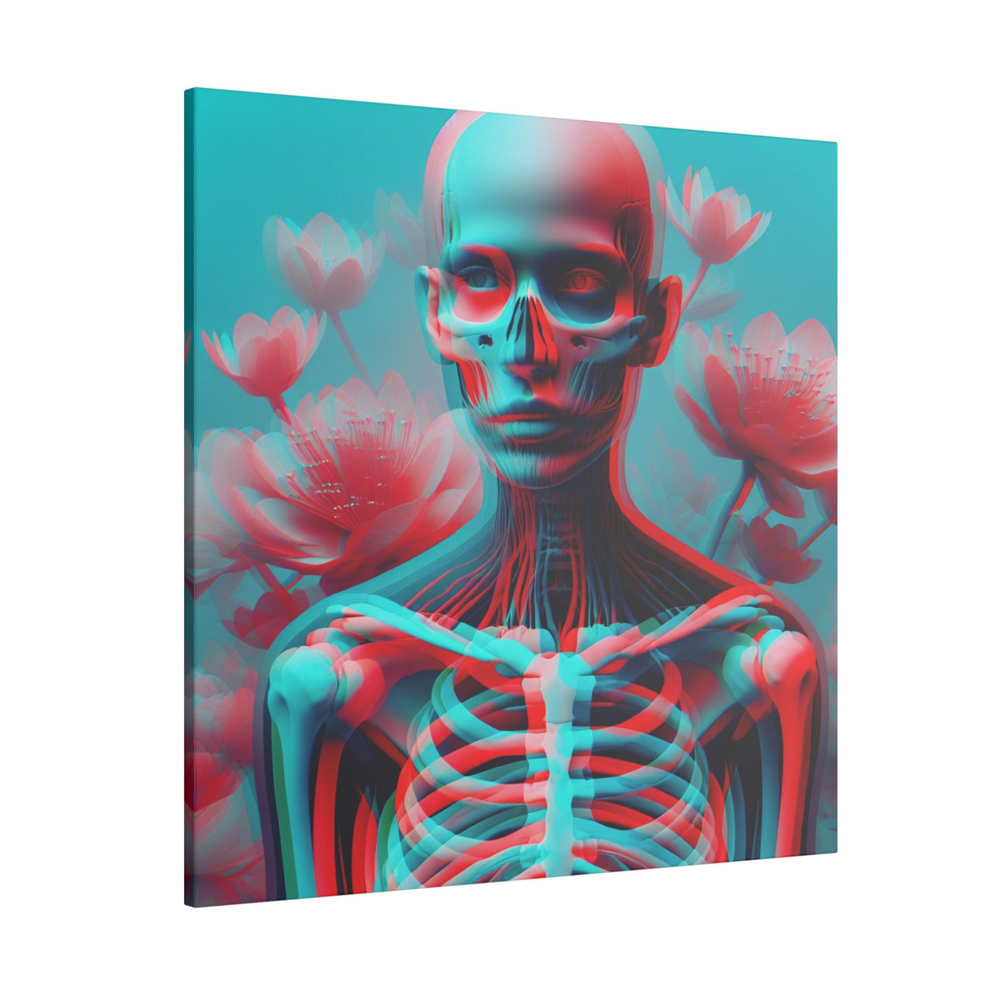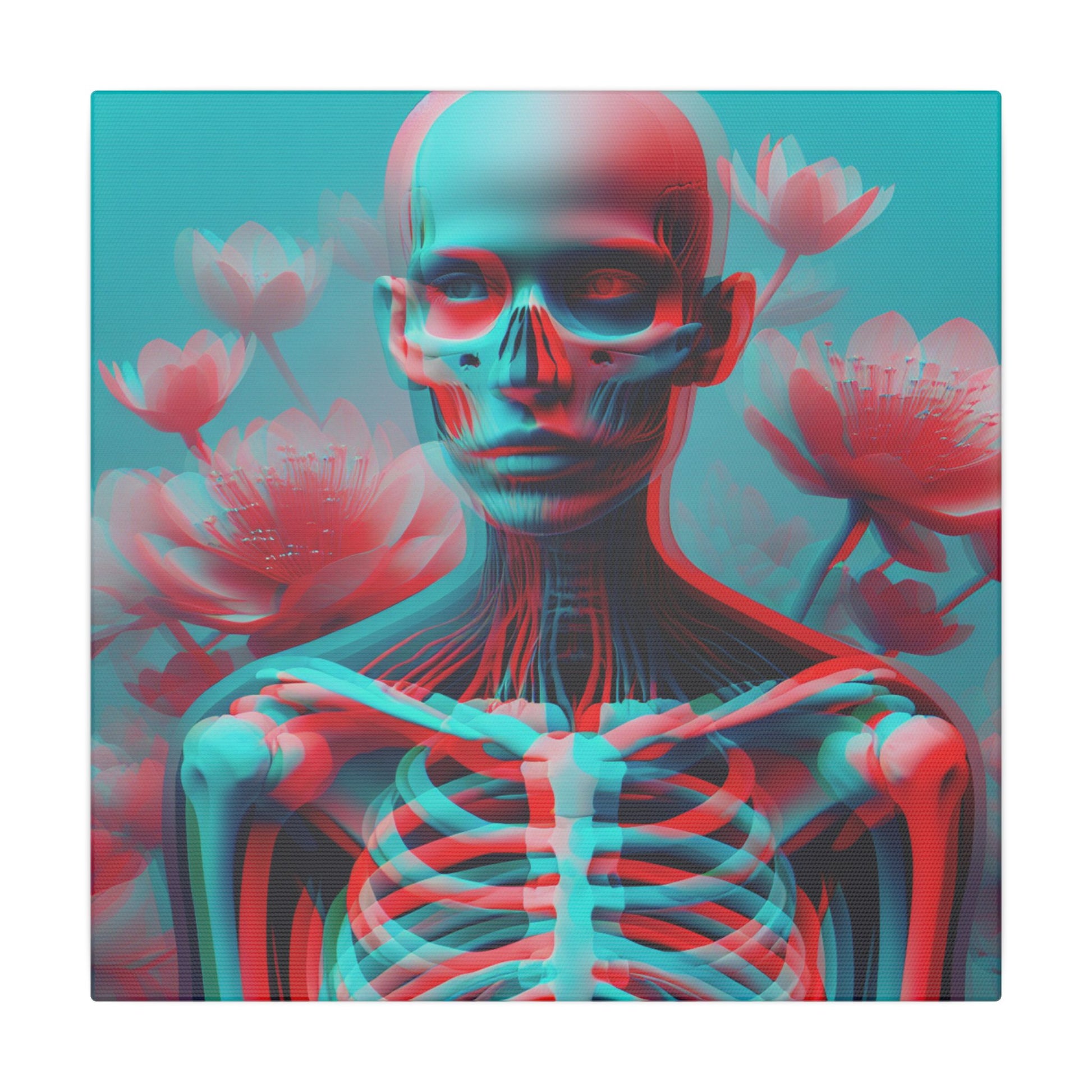 Elevate your space with this bold anaglyph-style canvas—A surreal transparent figure with a visible skeleton, vibrant red & cyan hues, and blooming flowers. Striking & high-res! #SurrealArt #Anaglyph #BoldDesign #CanvasArt #ModernAesthetic