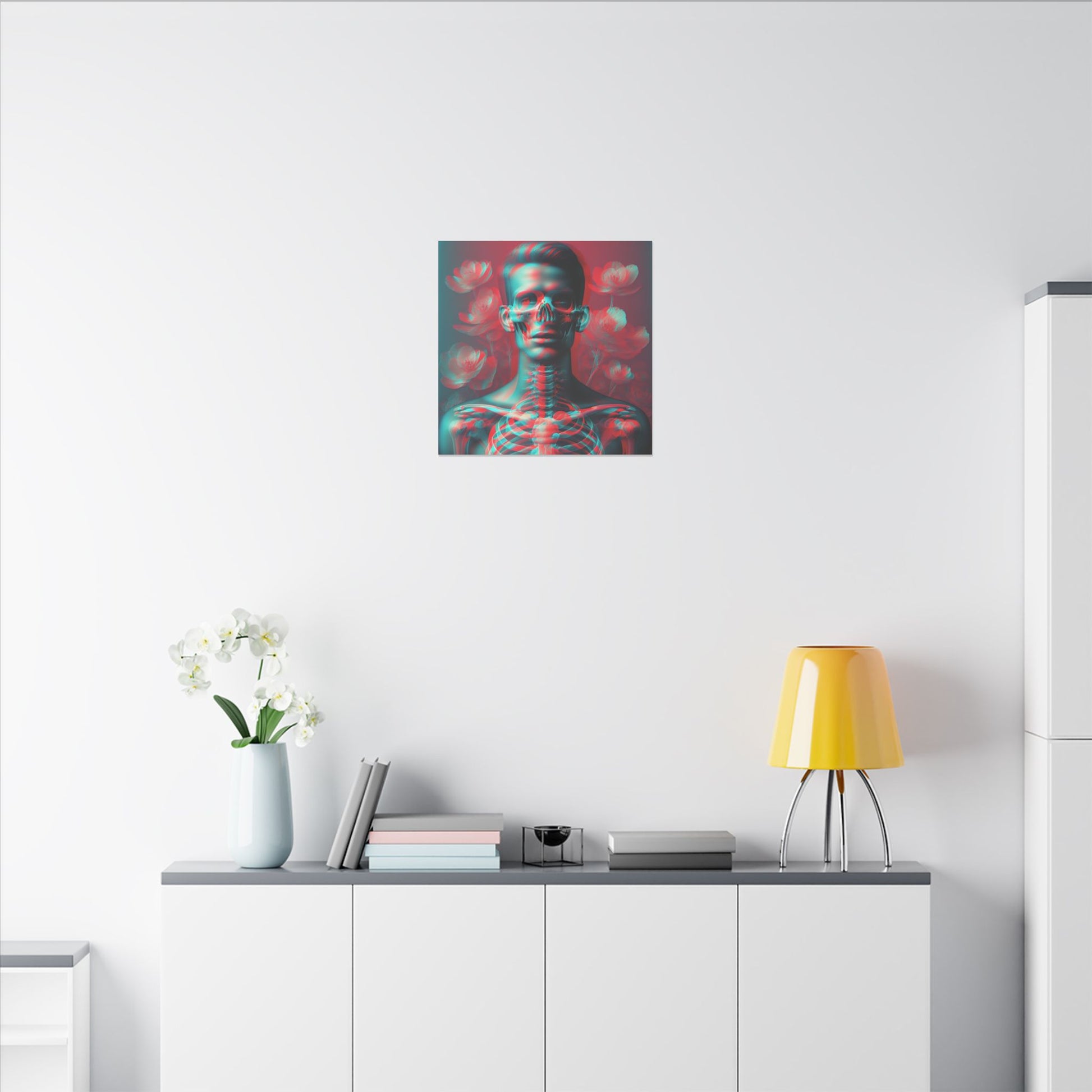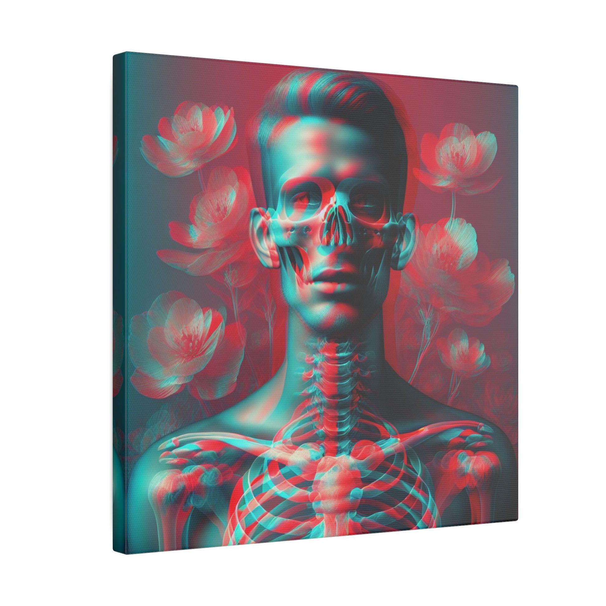Immerse in surrealism: Transparent human form with vivid skeletal design, red-cyan hues, and florals. A clear, striking face captivates in high-res detail. #SurrealArt #CanvasDecor #AnaglyphStyle