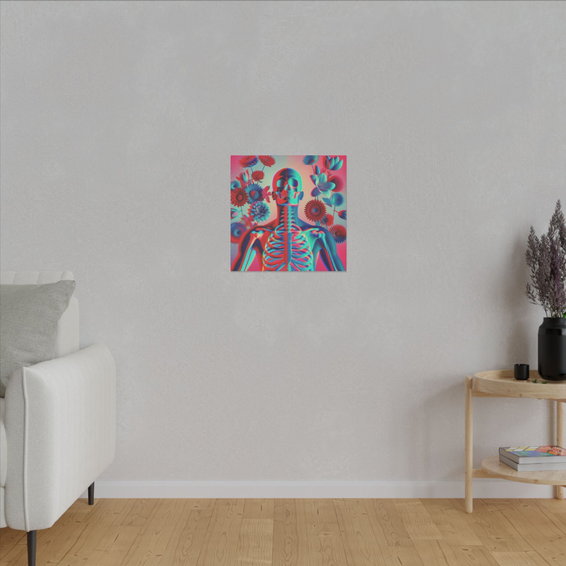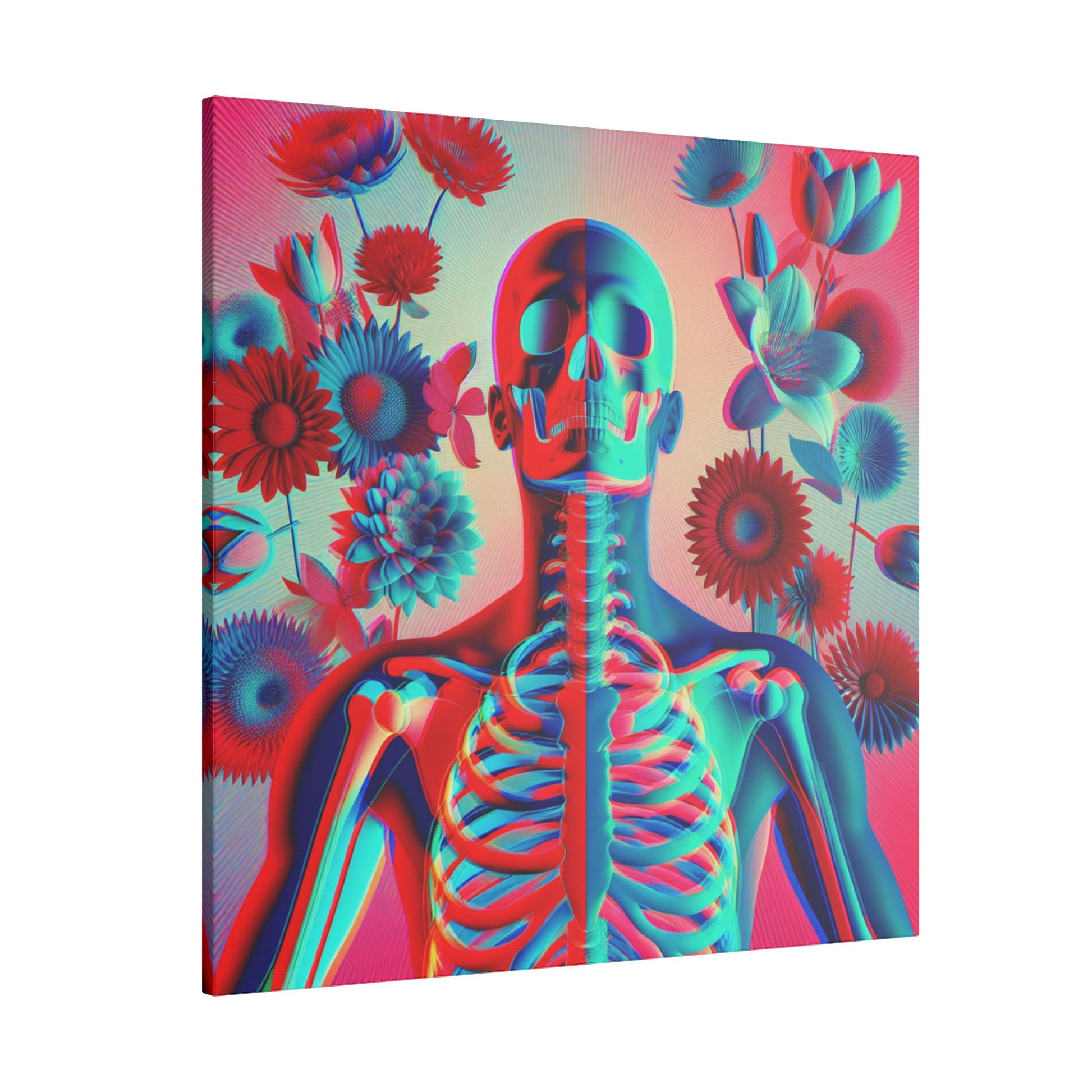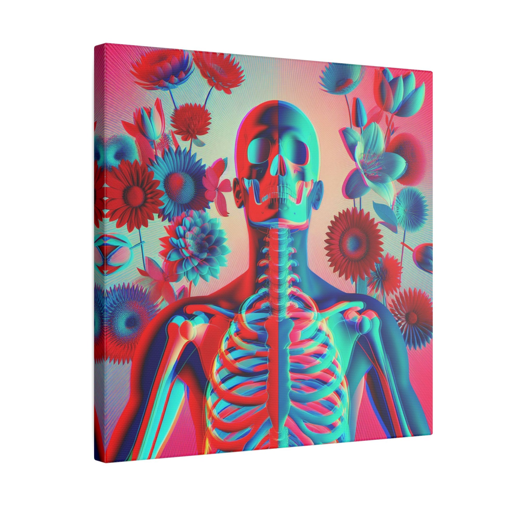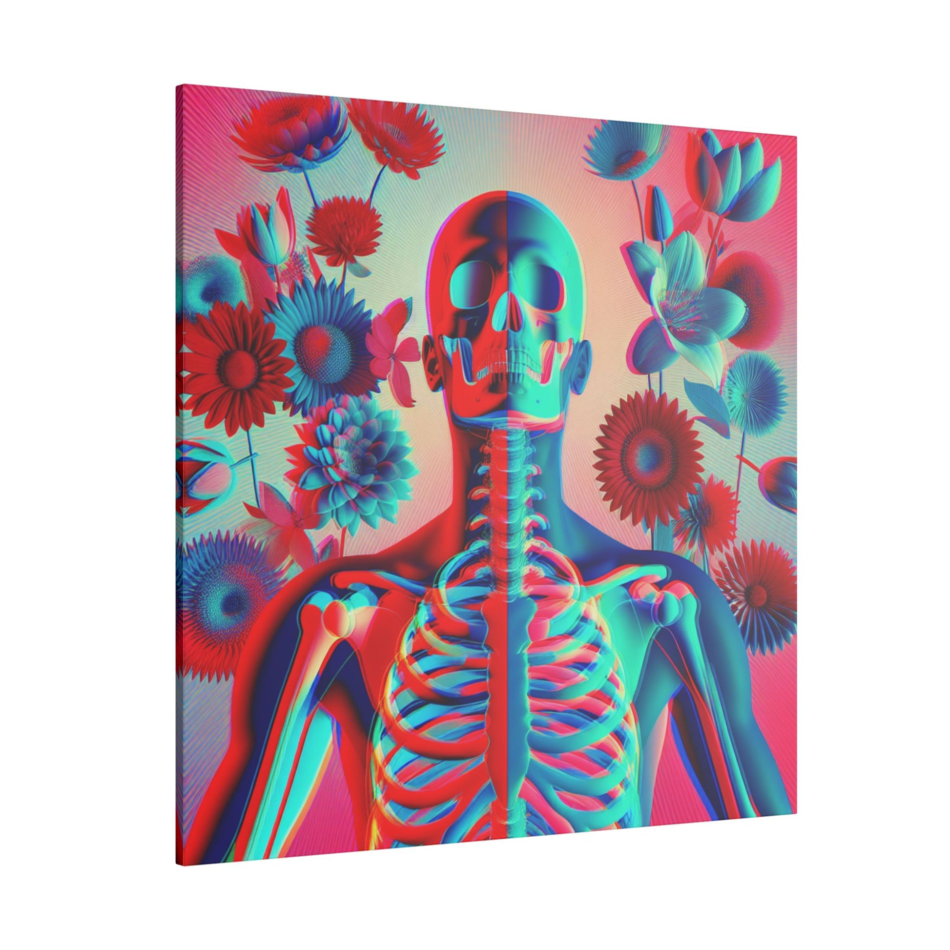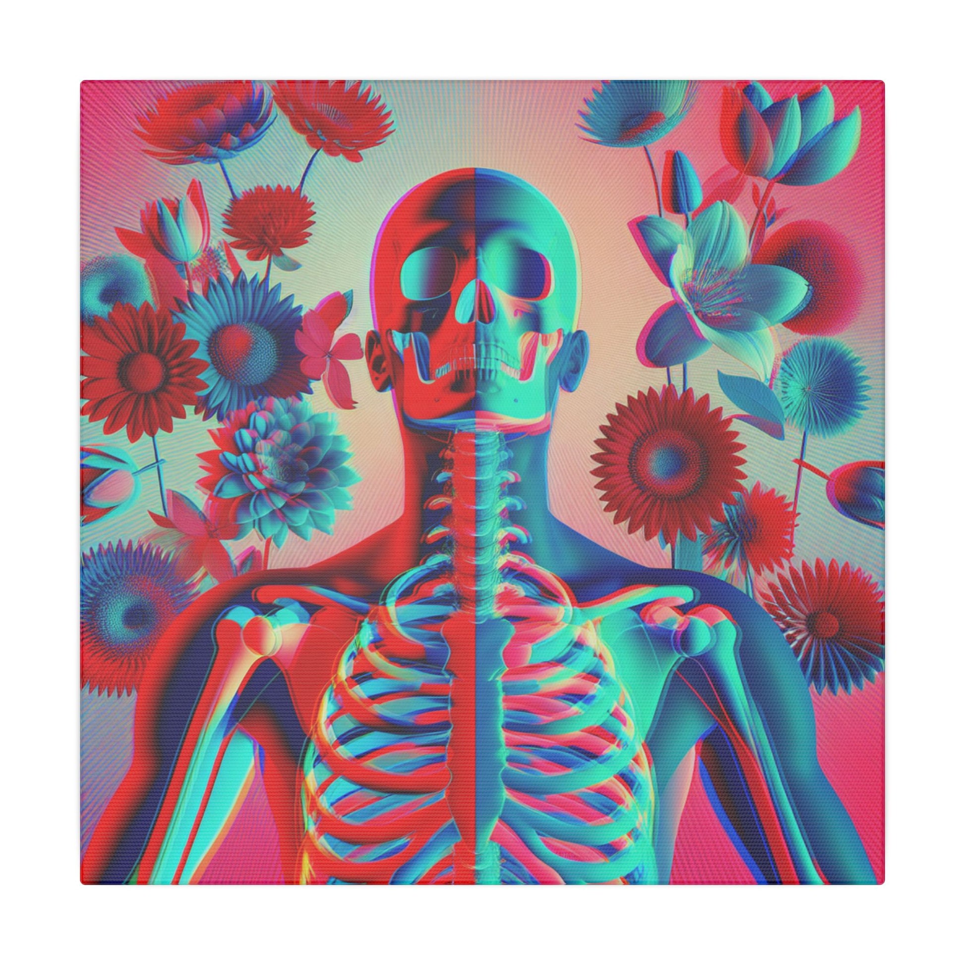 Immerse in surreal beauty: a vibrant anaglyph canvas blending a transparent figure, skeletal art, and floral elegance, strikingly overlaid with red & cyan hues. #SurrealArt #CanvasArt #BoldDesign #AnaglyphArt #ModernDecor