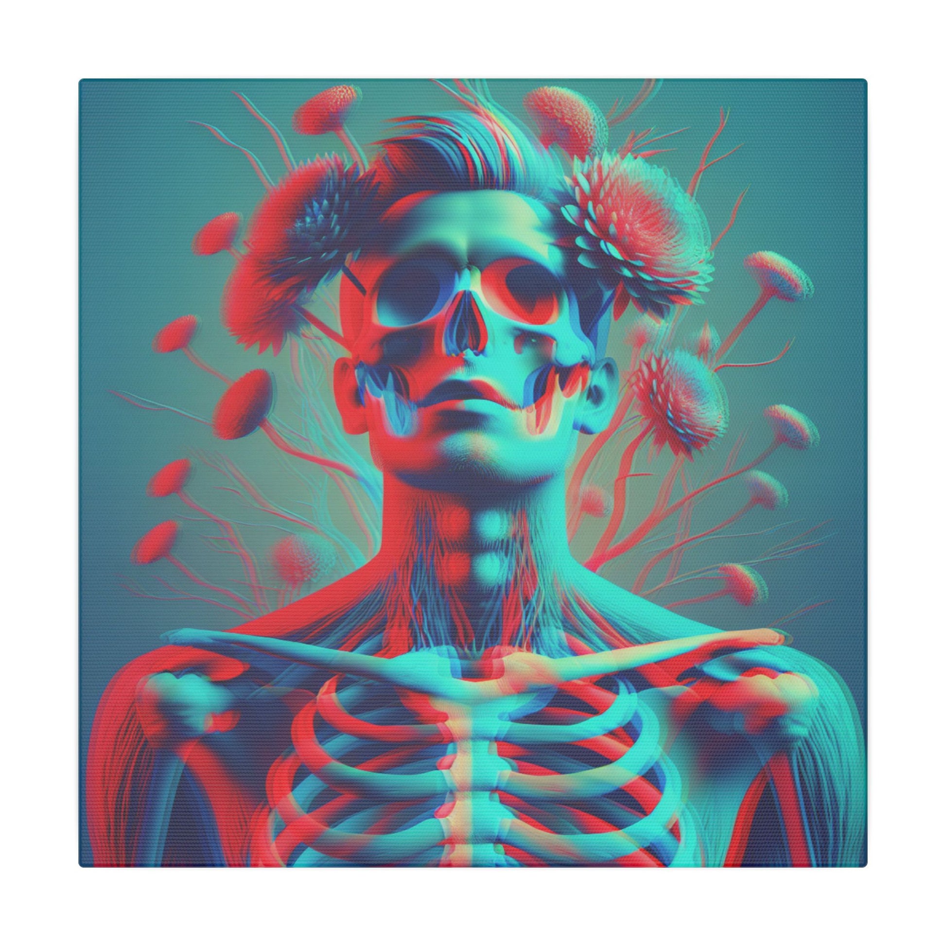 Bold anaglyph art: transparent [male/female] figure with visible skeleton, vivid red-cyan hues, florals, and clear captivating eyes. A surreal canvas masterpiece. #ModernArt #Surrealism #AnaglyphArt #CanvasDecor #CreativeDesign