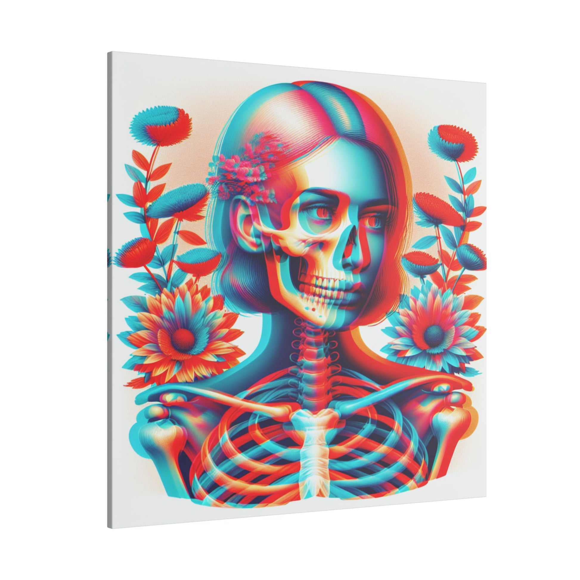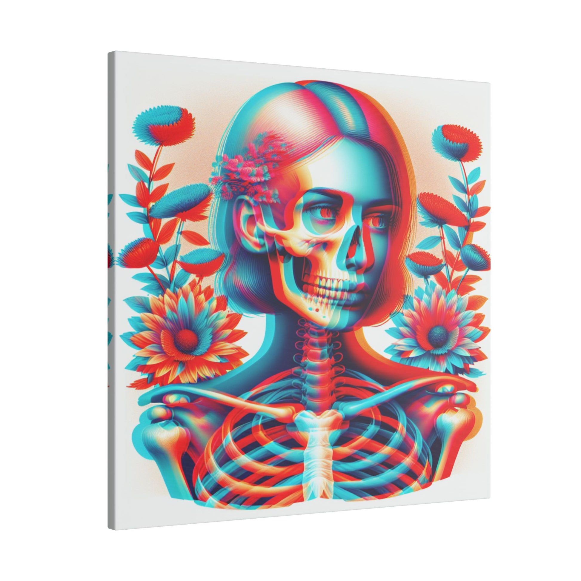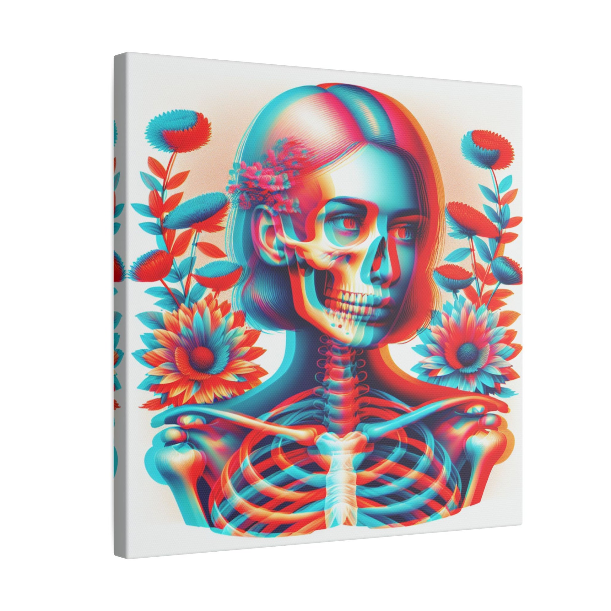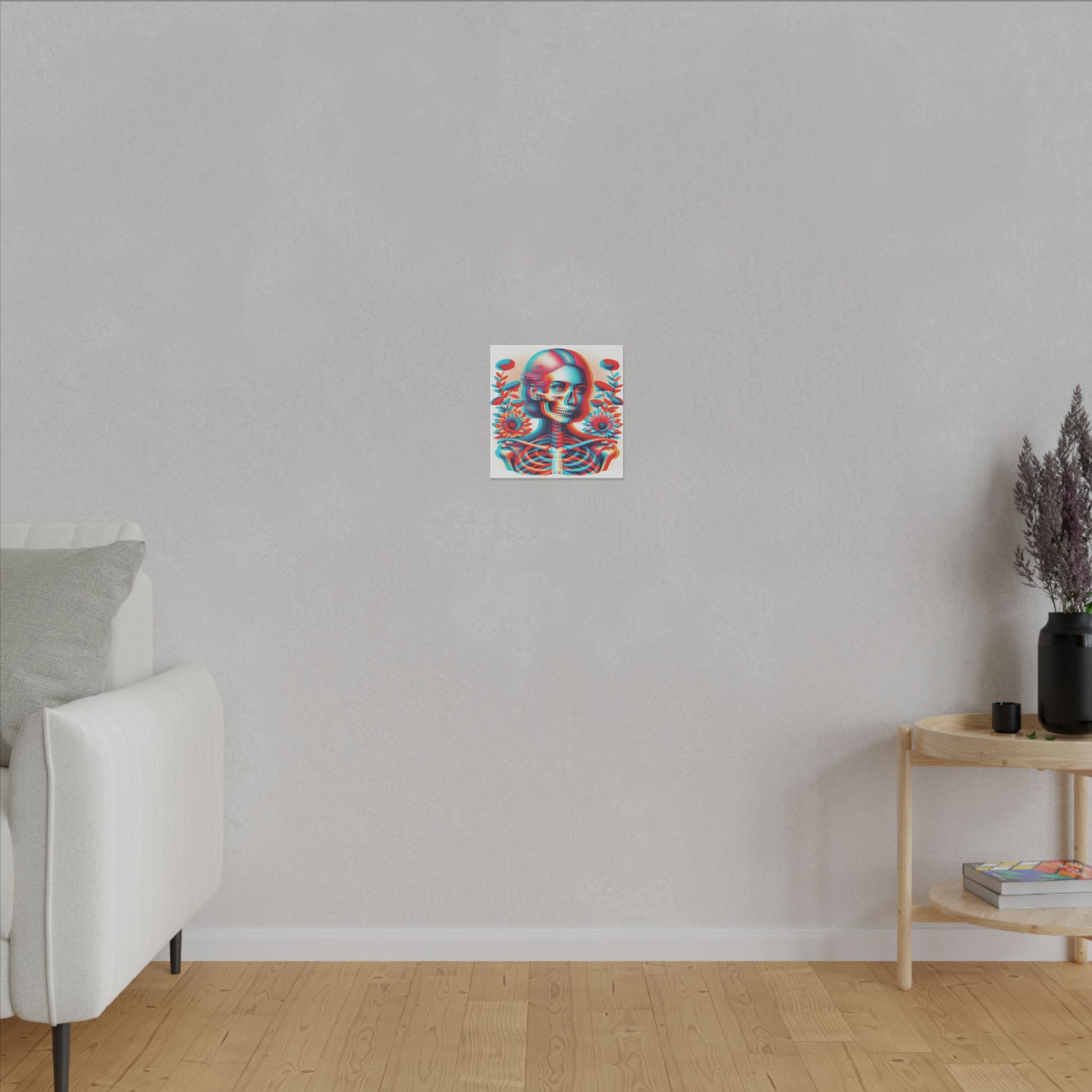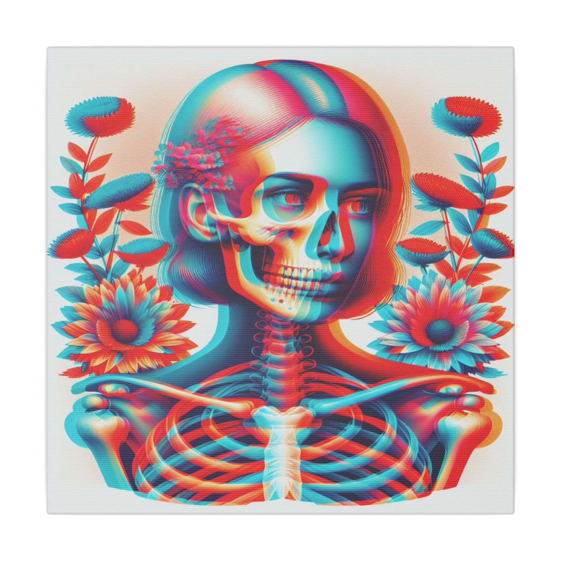 Bold surrealism meets vibrant color: A transparent [male/female] figure with striking skeletal detail, vivid red-cyan hues, and blooming flowers in high resolution. #AnaglyphArt #SurrealCanvas #BoldDesign #ArtDecor #ModernAesthetic