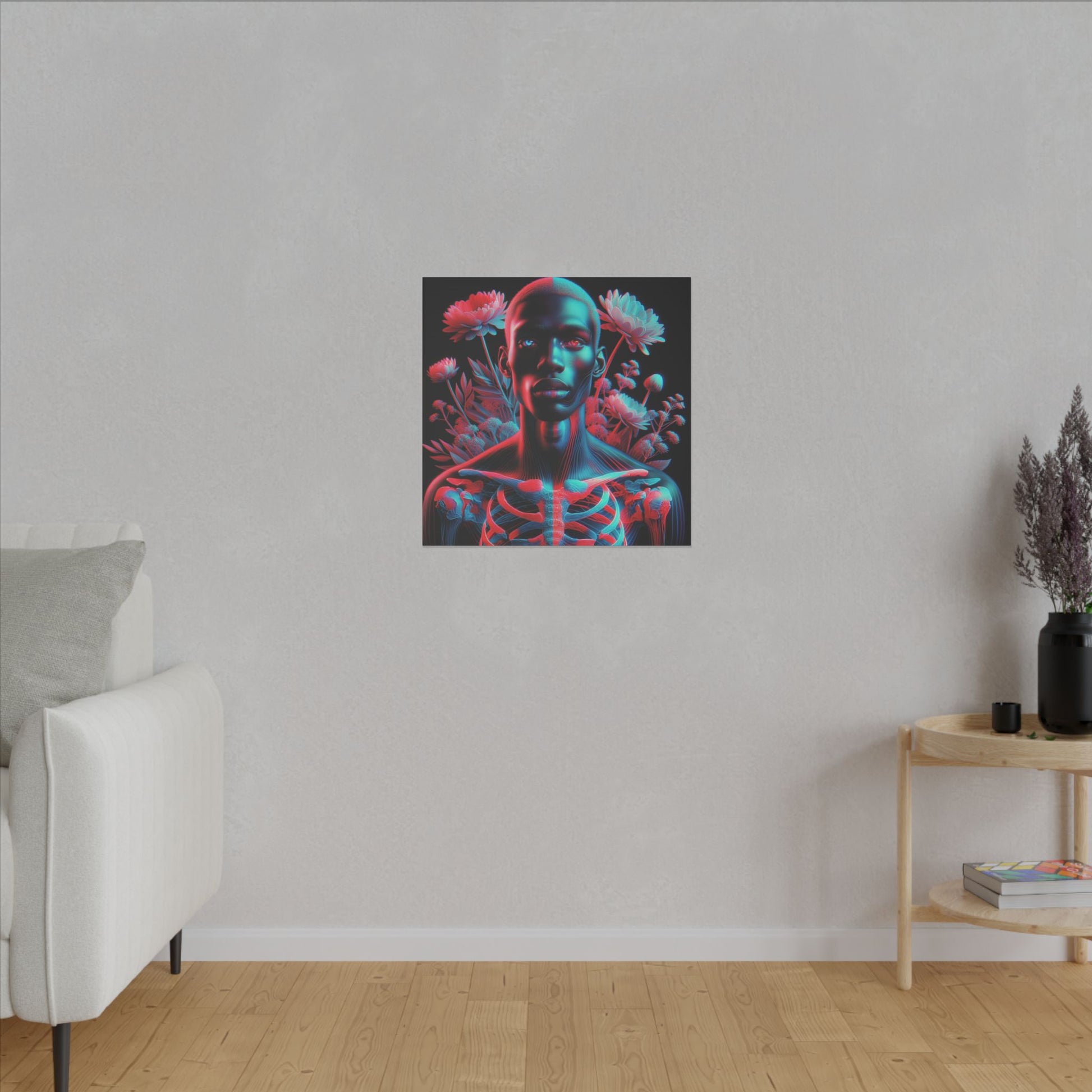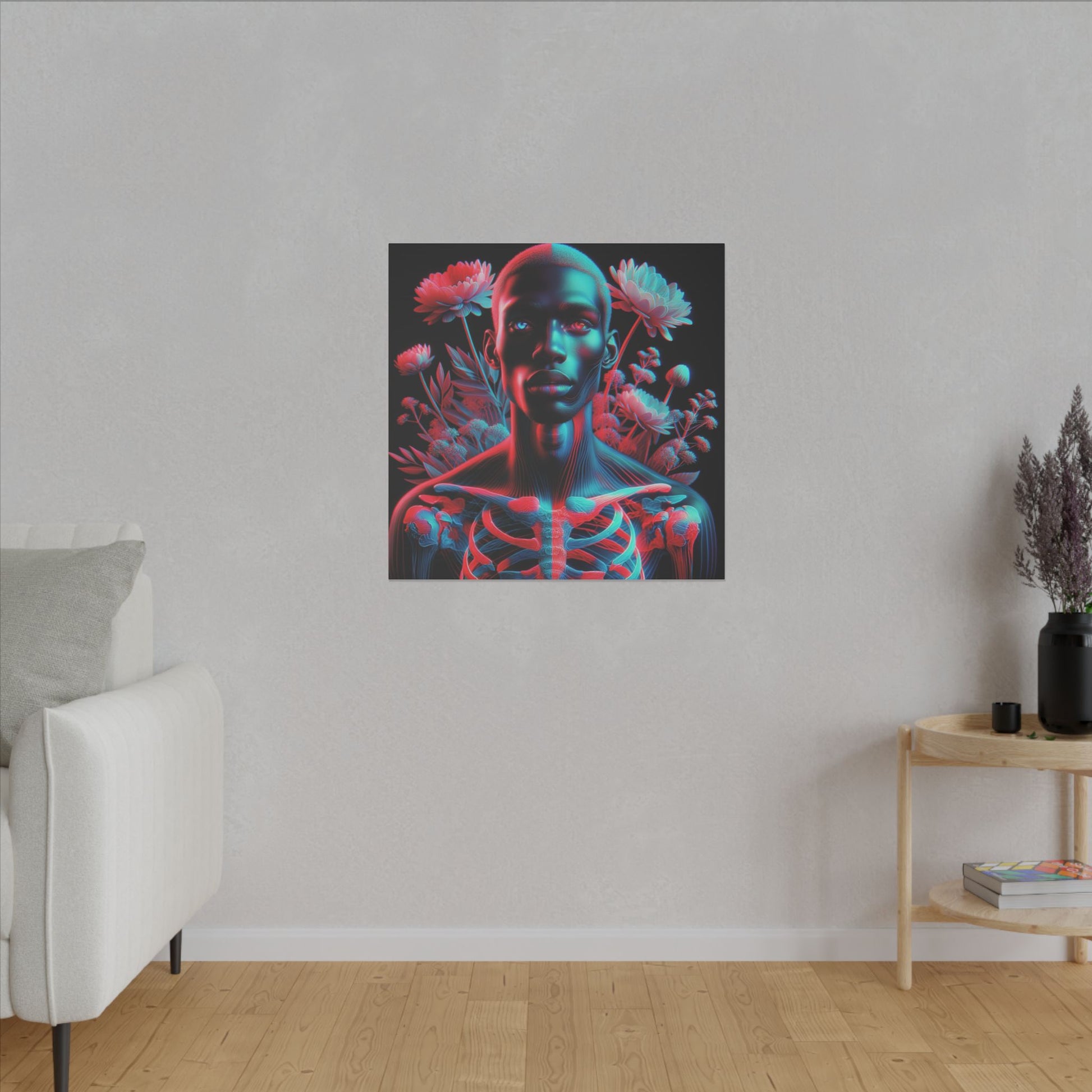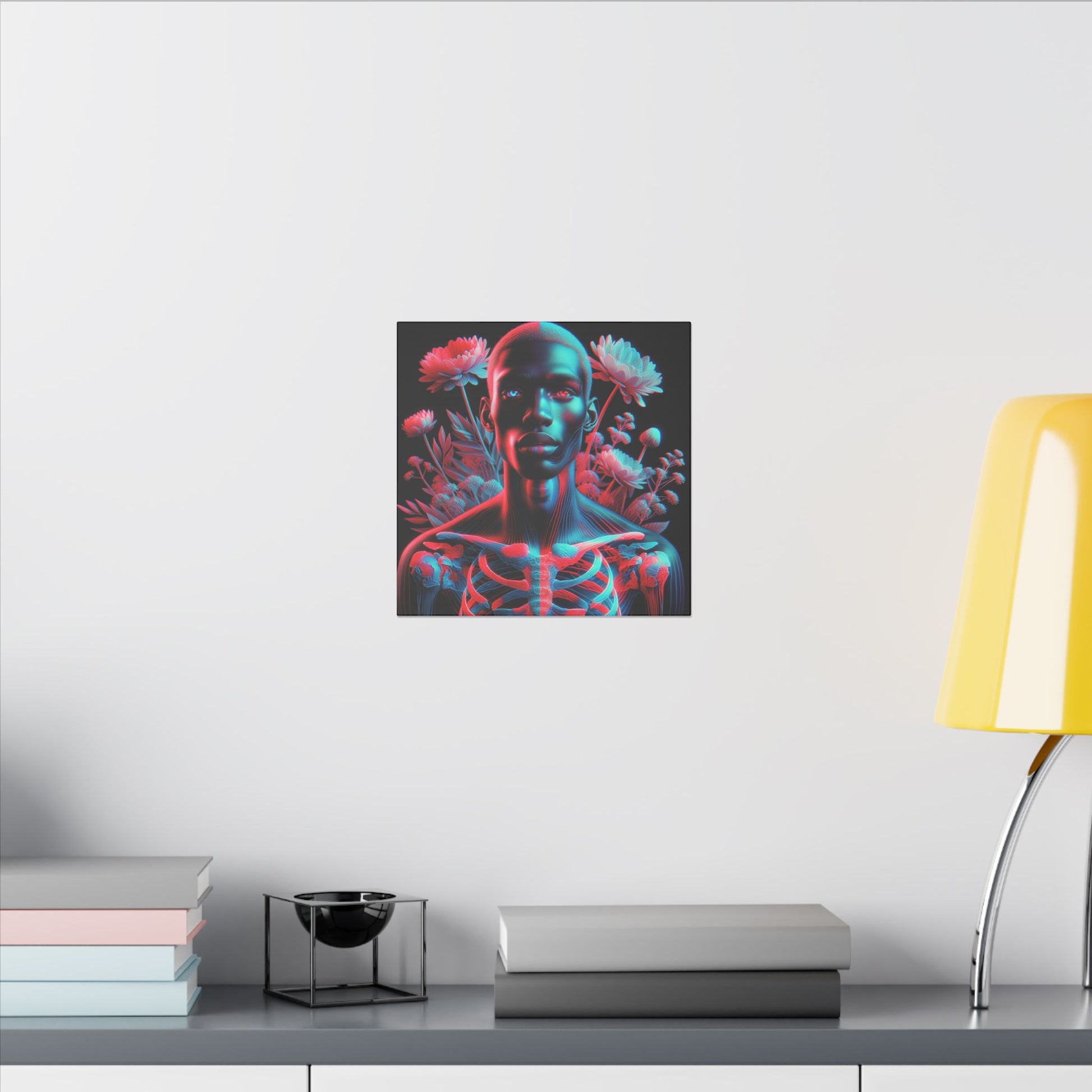 Unveil the beauty of the unseen with this striking anaglyph-style portrait. A luminous skeletal form merges with bold red and cyan hues, while expressive eyes captivate the soul. Ethereal flowers add a dreamlike touch, creating a mesmerizing and surreal masterpiece. #SurrealArt #Anaglyph #CanvasArt #Ethereal #Glow