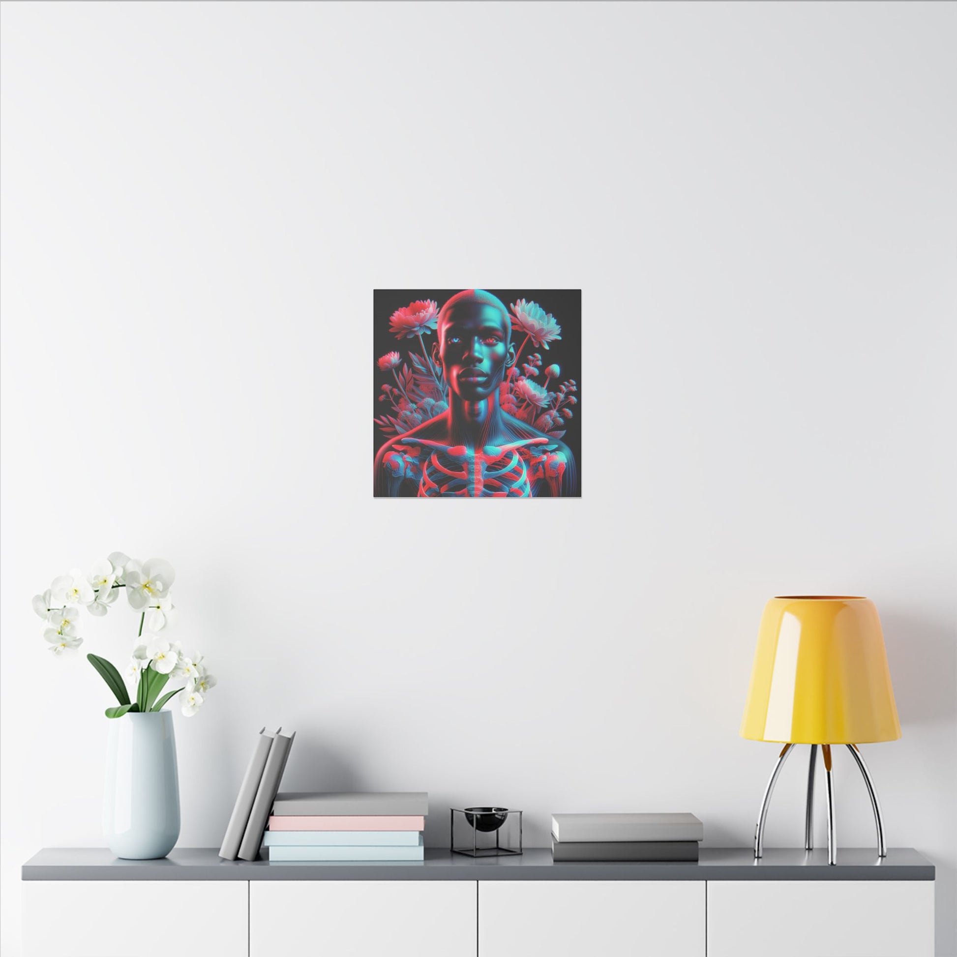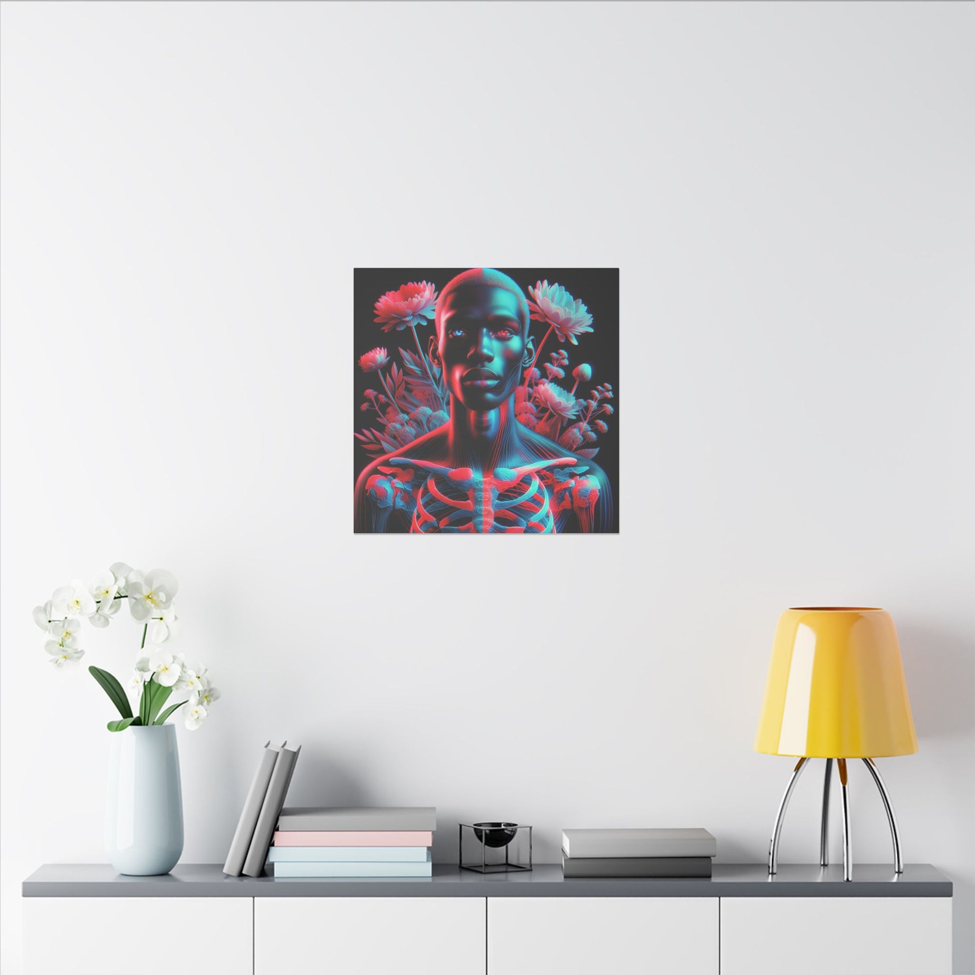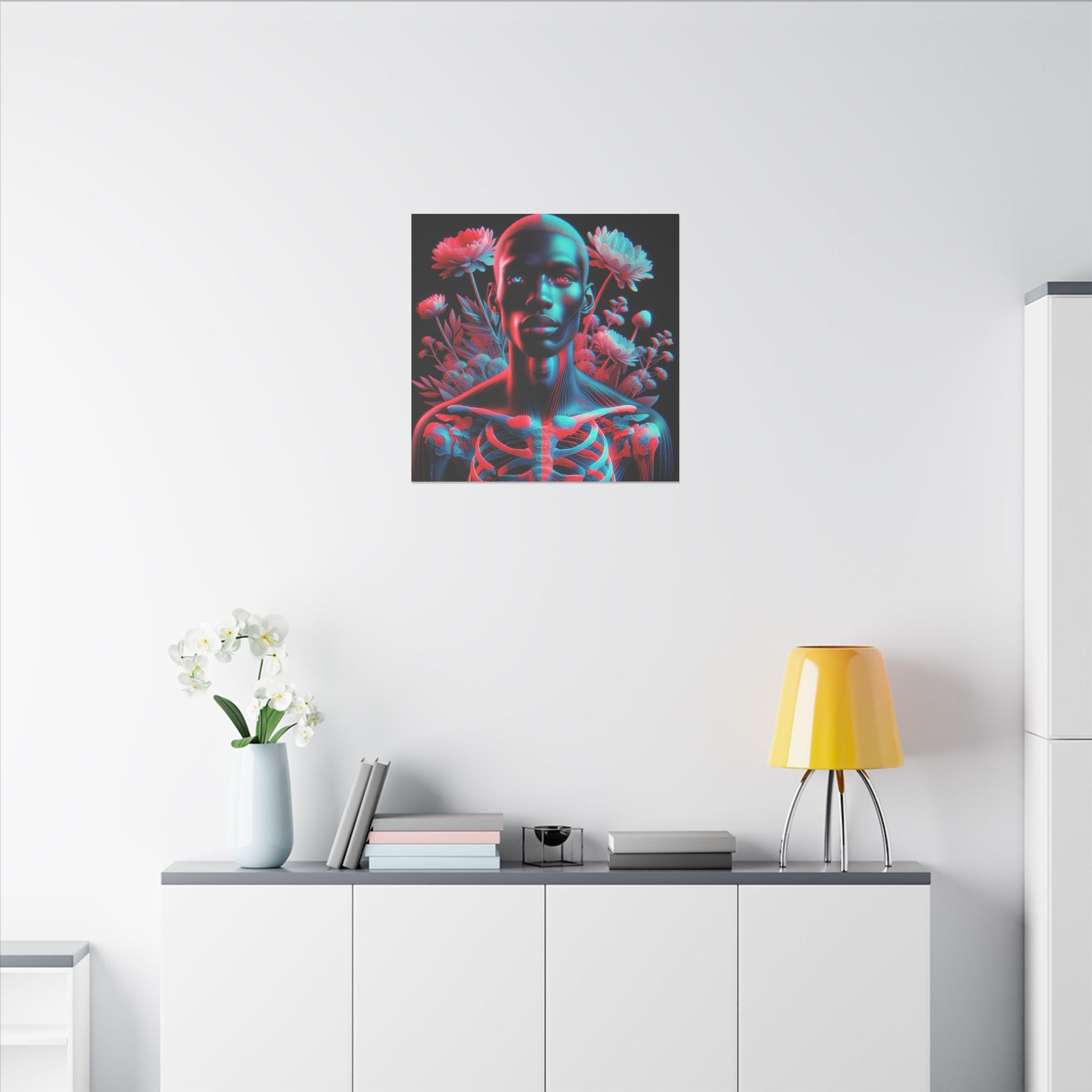 Unveil the beauty of the unseen with this striking anaglyph-style portrait. A luminous skeletal form merges with bold red and cyan hues, while expressive eyes captivate the soul. Ethereal flowers add a dreamlike touch, creating a mesmerizing and surreal masterpiece. #SurrealArt #Anaglyph #CanvasArt #Ethereal #Glow